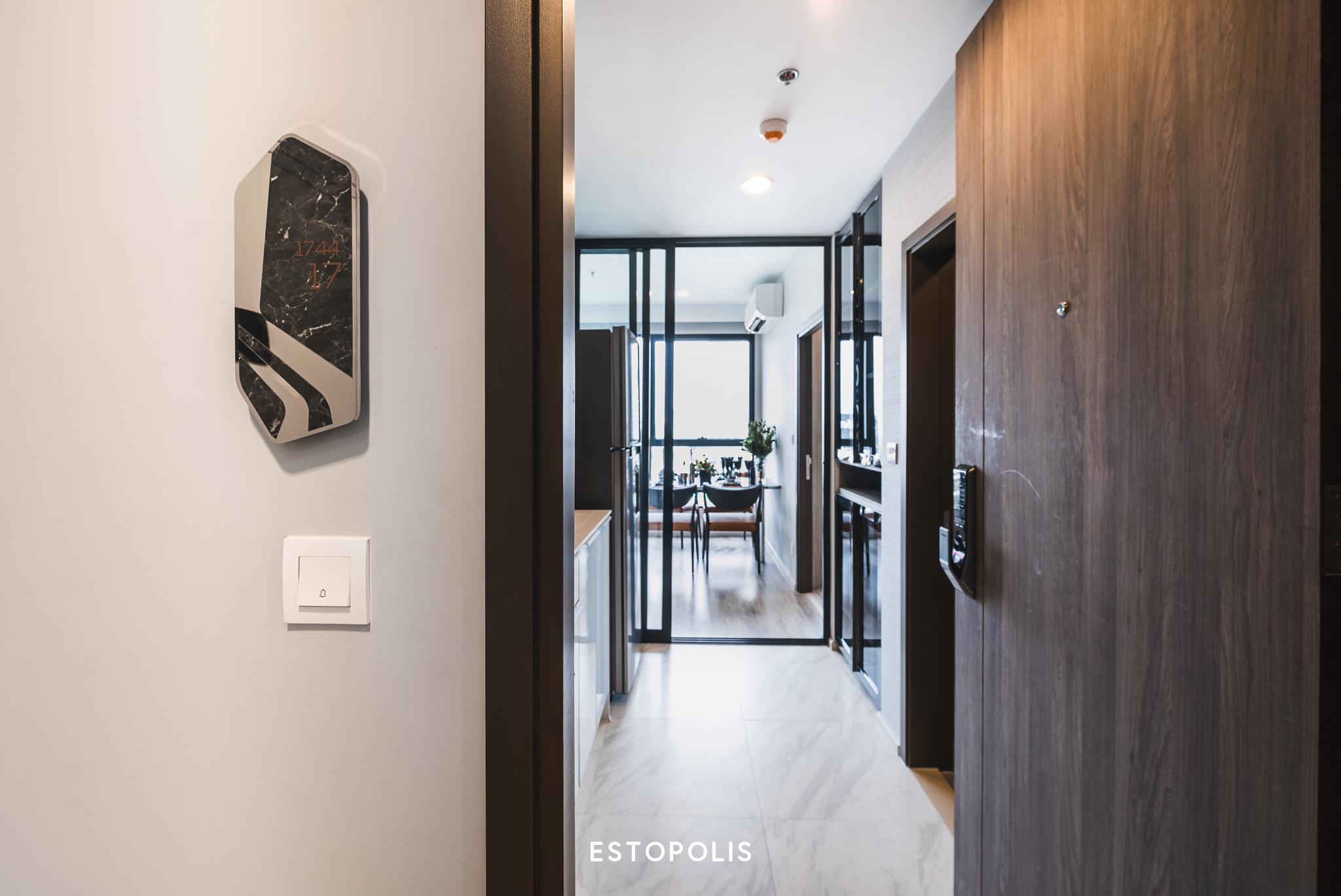 นอกจากนี้ห้องครัวยังเป็นทางที่ใช้เชื่อมไปยังห้องน้ำและห้องนอนอีกด้วย เราจึงสามารถแบ่งสัดส่วนพื้นที่ส่วนตัวออกจากพื้นที่ใช้สอยส่วนรวมได้ชัดเจน ช่วยลดความวุ่นวายภายในห้องพักอาศัยได้เป็นอย่างดี