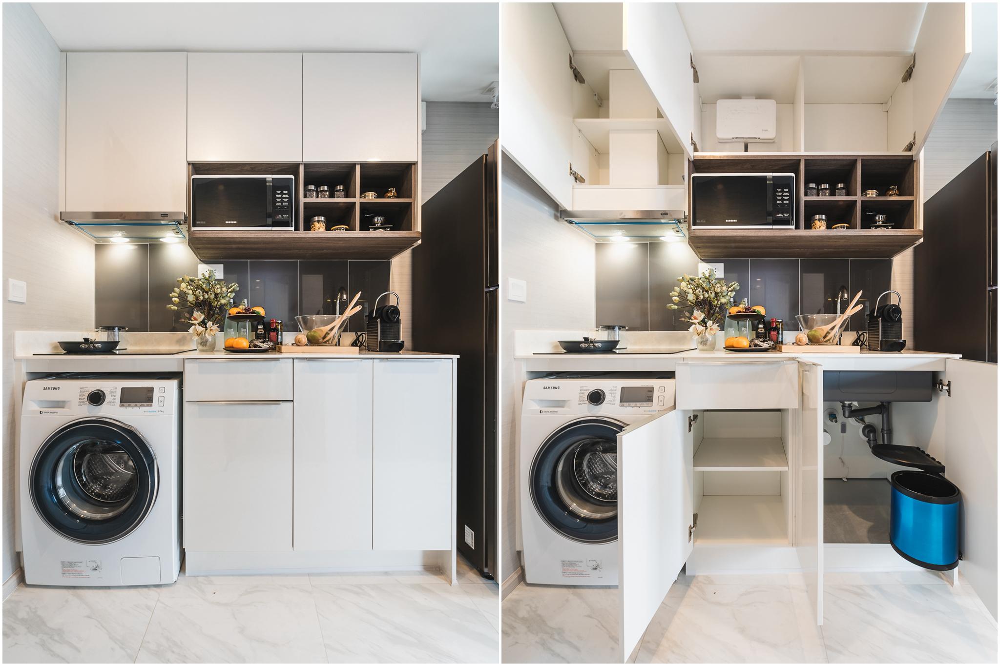 ภายในห้องครัว...ฝั่งซ้ายมือจะเป็นชุดครัวบิลต์อิน ที่ทางโครงการได้ให้เคาน์เตอร์ครัวทำจากวัสดุลามิเนตผิวเคลือบเงาสีขาว พร้อมเว้นพื้นที่สำหรับใส่เครื่องซักผ้าฝาหน้าไว้ให้เรียบร้อย โดยบานตู้และลิ้นชักต่างๆ เป็นแบบ Soft Close ทั้งหมด ช่วยลดแรงกระแทกและยืดอายุการใช้งานให้ยาวนานยิ่งขึ้น