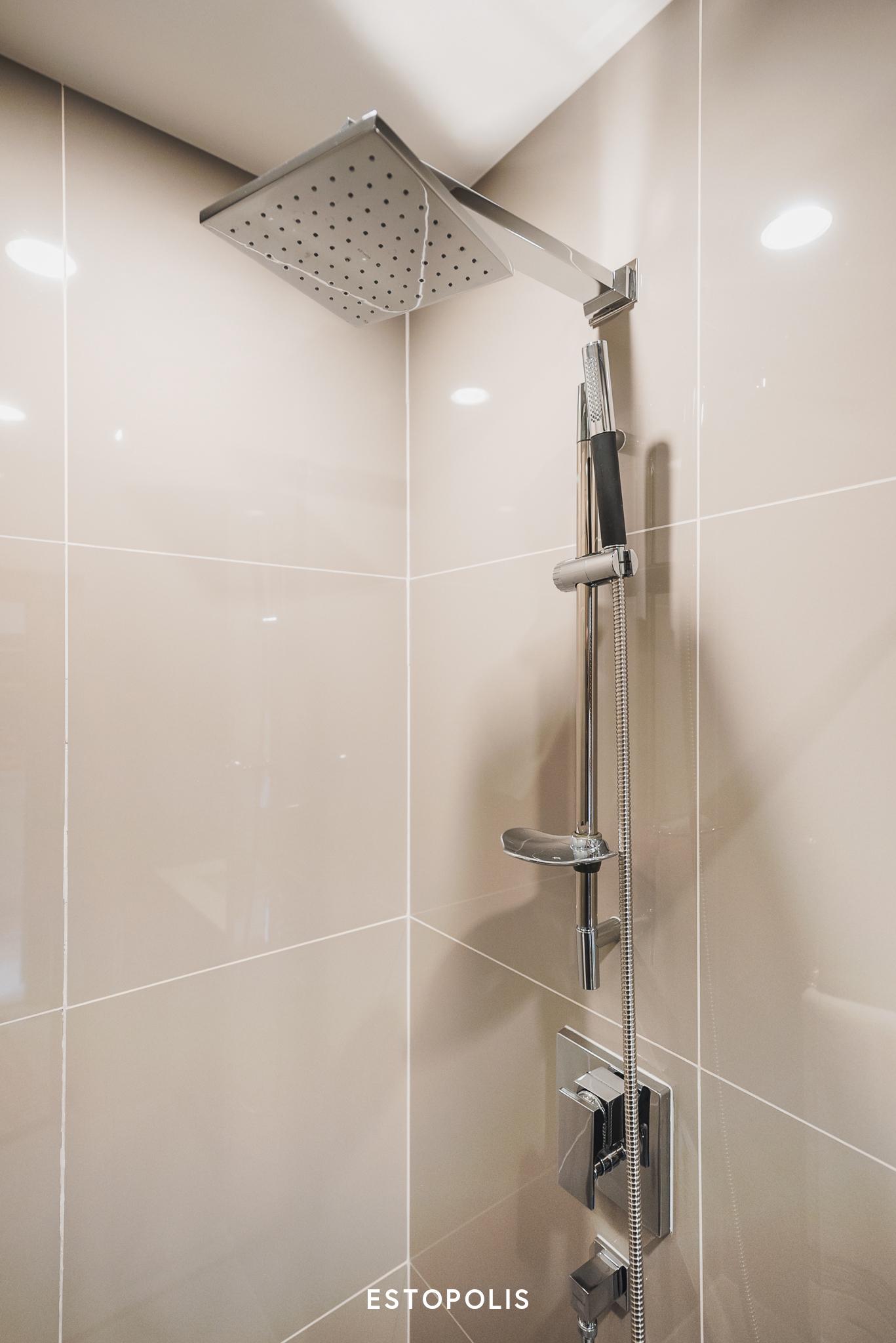และแล้วก็ถึงเวลาเดินเข้าไปในห้องอาบน้ำ เพื่อรอรับความสดชื่นจาก Rain Shower และ Hand Shower ที่ทางโครงการติดตั้งให้เรียบร้อย พร้อมกั้นส่วนเปียกด้วยประตูใส Temper Glass จากแบรนด์ Showerking ส่วนบริเวณพื้นด้านล่างก็มีการยกธรณีขึ้น สำหรับป้องกันน้ำไม่ให้ไหลเปียกออกไปด้านนอก