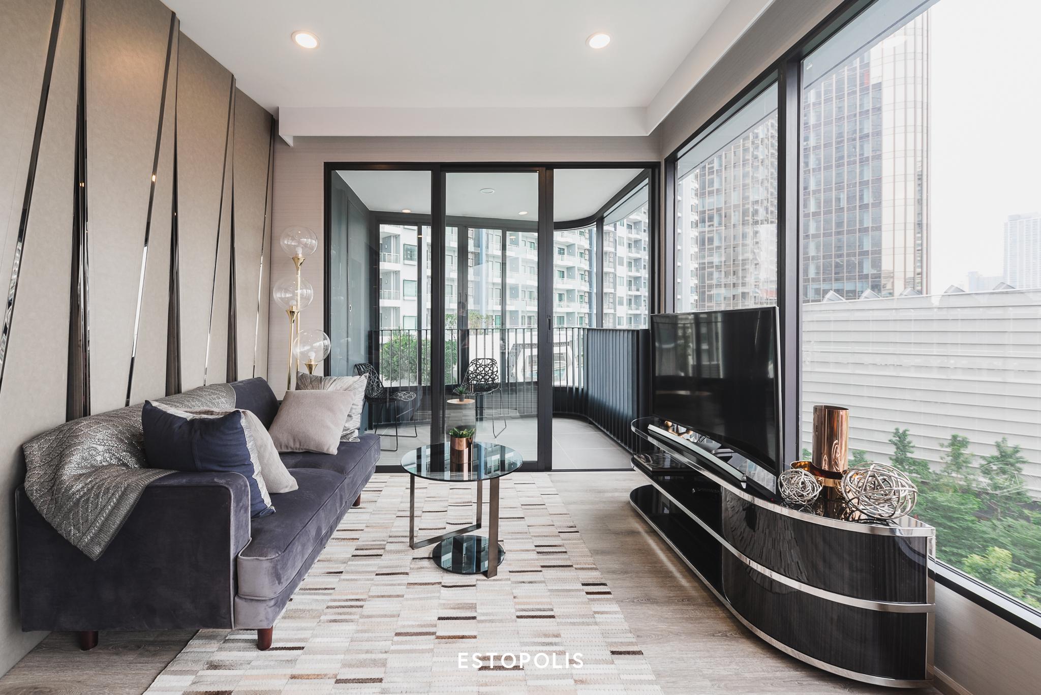 จุดเด่นของห้อง 2 Bedrooms จะอยู่ที่ระเบียงขนาดใหญ่พร้อมติดกระจกโค้งบานสูง ทำให้เราสามารถชมวิวรอบโครงการได้อย่างมีสะดุด แบบที่ไม่โดนบล็อกวิวในระยะประชิด ซึ่งค่อนข้างหาได้ยากในทำเลใจกลางเมืองอโศกแบบนี้