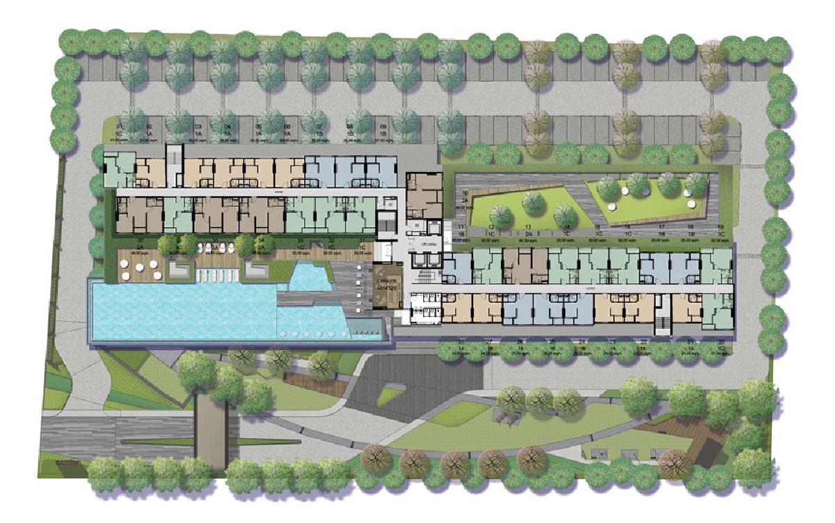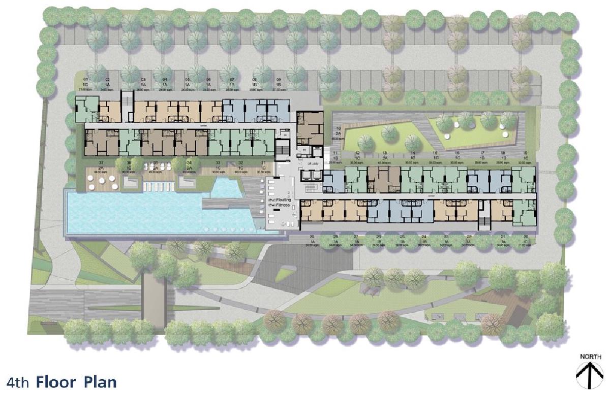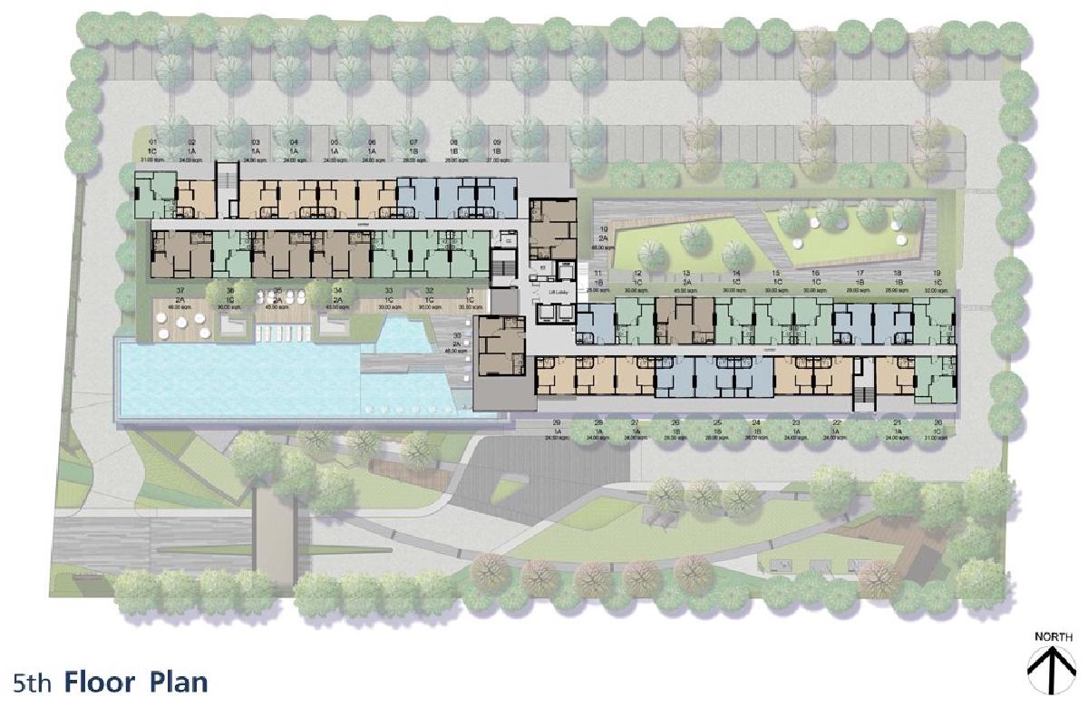 ในฝั่งทิศใต้พื้นที่ส่วนกลางในชั้น 3 จะเป็นสระว่ายน้ำขนาดใหญ่ของทางโครงการ