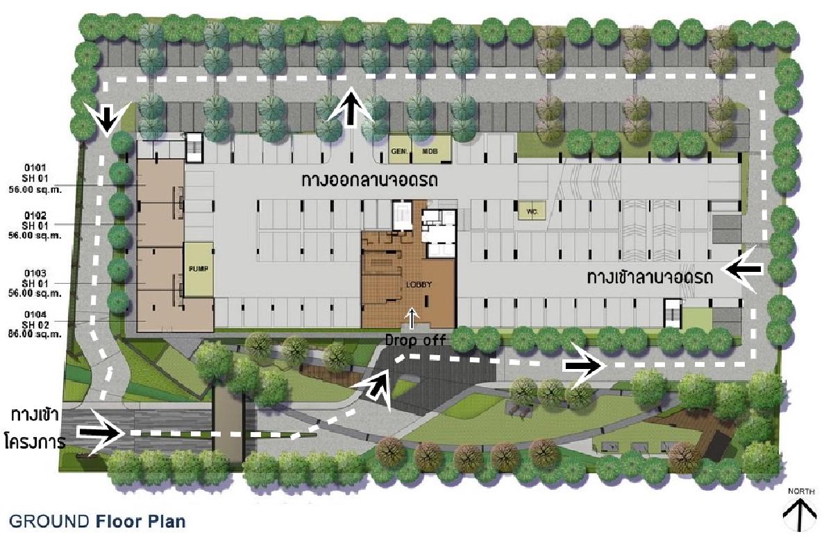 ผังอาคารในชั้น Ground floor แสดงพื้นที่ชั้นล่างของโครงการ ฟิวส์ เซนเซ่ บางแค (Fuse Sense Bangkae) ที่รายล้อมด้วยพื้นที่สีเขียว เคียงข้างไปกับถนนเดินรถภายในโครงการ ด้านหน้าโครงการติดกับถนนพุทธมณฑลสาย 2 แต่ร่นระยะอาคารเข้ามาเล็กน้อย ทำให้มีความเป็นส่วนตัวเพิ่มขึ้น ด้านหน้าอาคารจะมียูนิตร้านค้า 4 ยูนิต เข้ามาด้านในอีกหน่อยจะเจอกับทางเข้าล็อบบี้ มี Mail box และโถงลิฟต์แบบล็อกชั้นเปิดให้บริการอยู่ 2 ตัว อีก 1 ตัวจะเป็นลิฟต์ขนของ ส่วนลานจอดรถจะมีทั้งจอดภายในอาคาร (ชัั้น1-2) และรอบอาคาร
