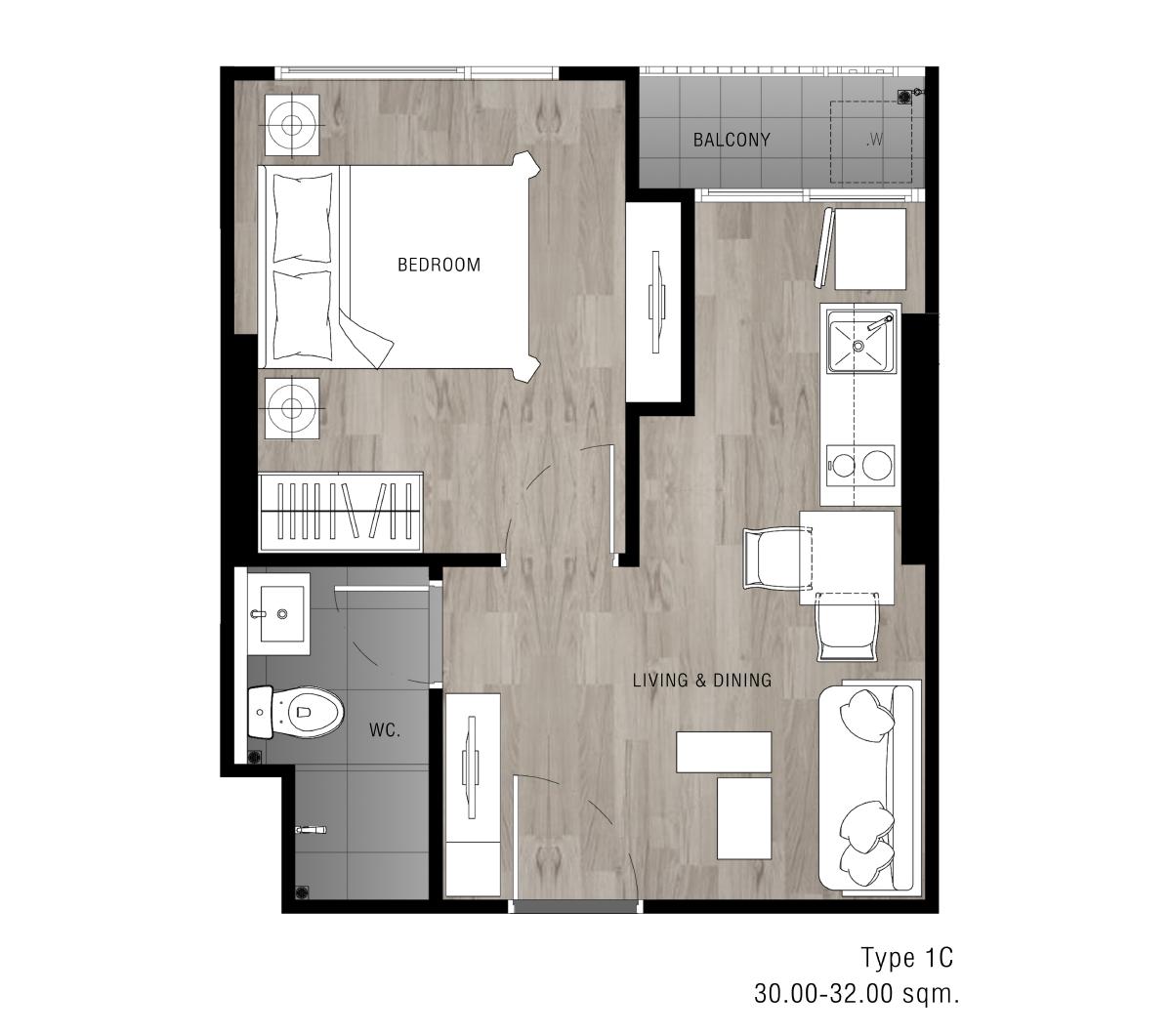 1 Bedrooms พื้นที่ใช้สอย 30 ตร.ม. ราคาเริ่มต้น 1.59 ล้านบาท