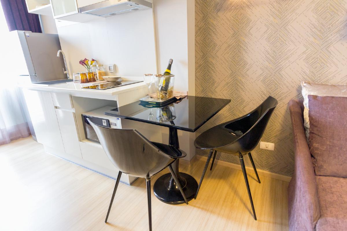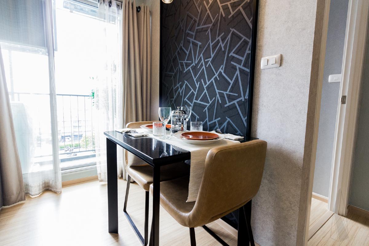 ตรงข้ามชุดครัวจะเป็นเก้าอี้รับประทานอาหารแบบ 2 ที่นั่ง จัดชิดไว้มุมห้อง