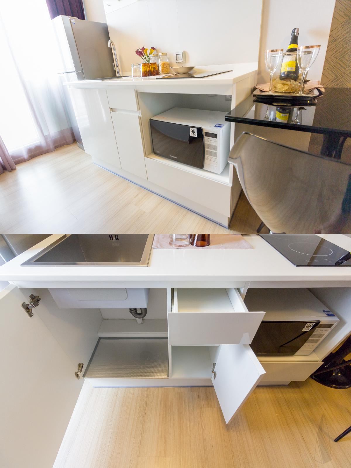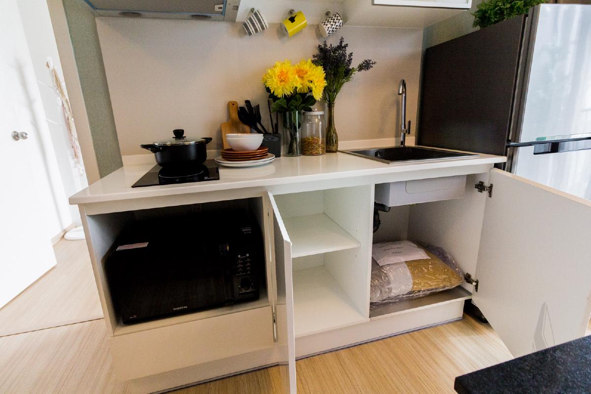 เคาน์เตอร์ครัวจะมีช่องสำหรับวางไมโครเวฟ และช่องเก็บของมี ประตูปิดไว้เรียบร้อย