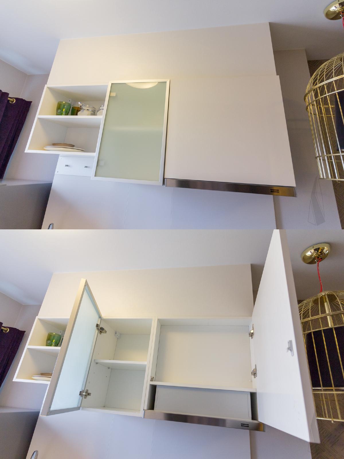 ชั้นลอยด้านบนจะมีชั้นเก็บของแบบมีประตูเปิด-ปิด ด้านในจะมีชั้นเล็กๆ ไว้เก็บของกระจุกกระจิก