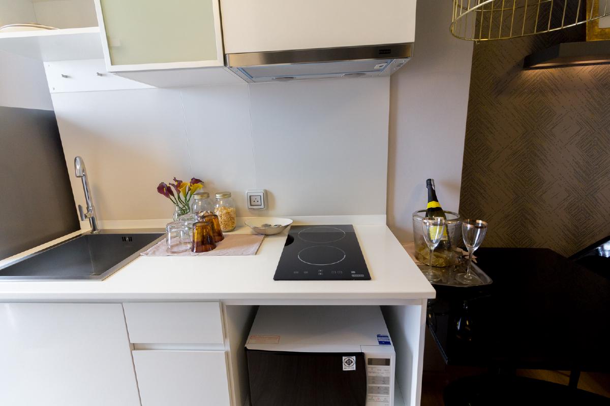 พื้นที่จัดเตรียมอาหารมีไว้ให้ค่อนข้างกว้าง เพราะไม่ได้แถมเตาไฟฟ้าและเครื่องดูดควันมาให้ บริเวณมุมเคาน์เตอร์ทำจุดปลั๊กไฟพร้อมฝาครอบสำหรับเสียบเครื่องใช้ไฟฟ้าไว้ให้ด้วย