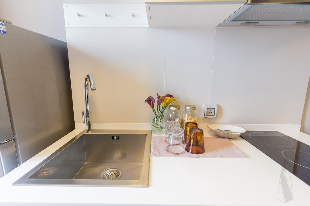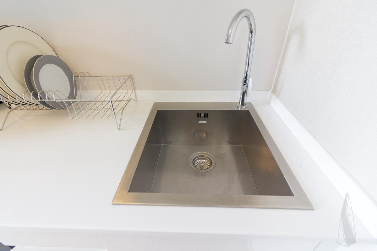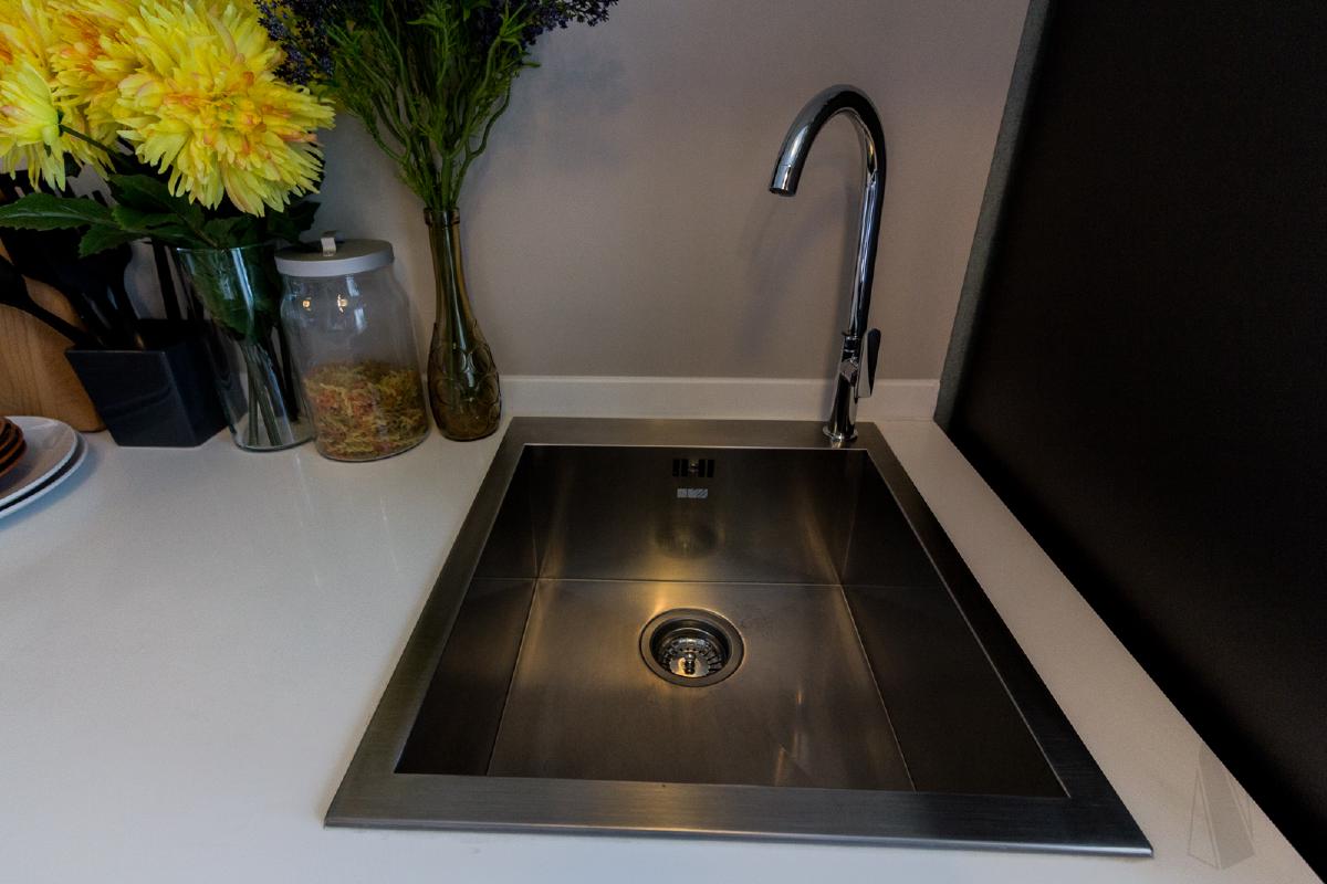 อ่างล้างจานเป็นแบบหลุมเดี่ยวของ Franke พร้อมก๊อกน้ำที่สามารถเปลี่ยนทิศทางได้ เพื่อให้ง่ายต่อการล้างจาน