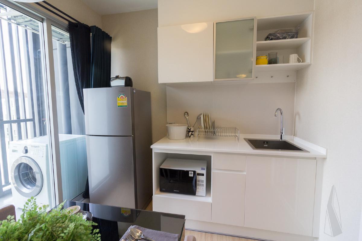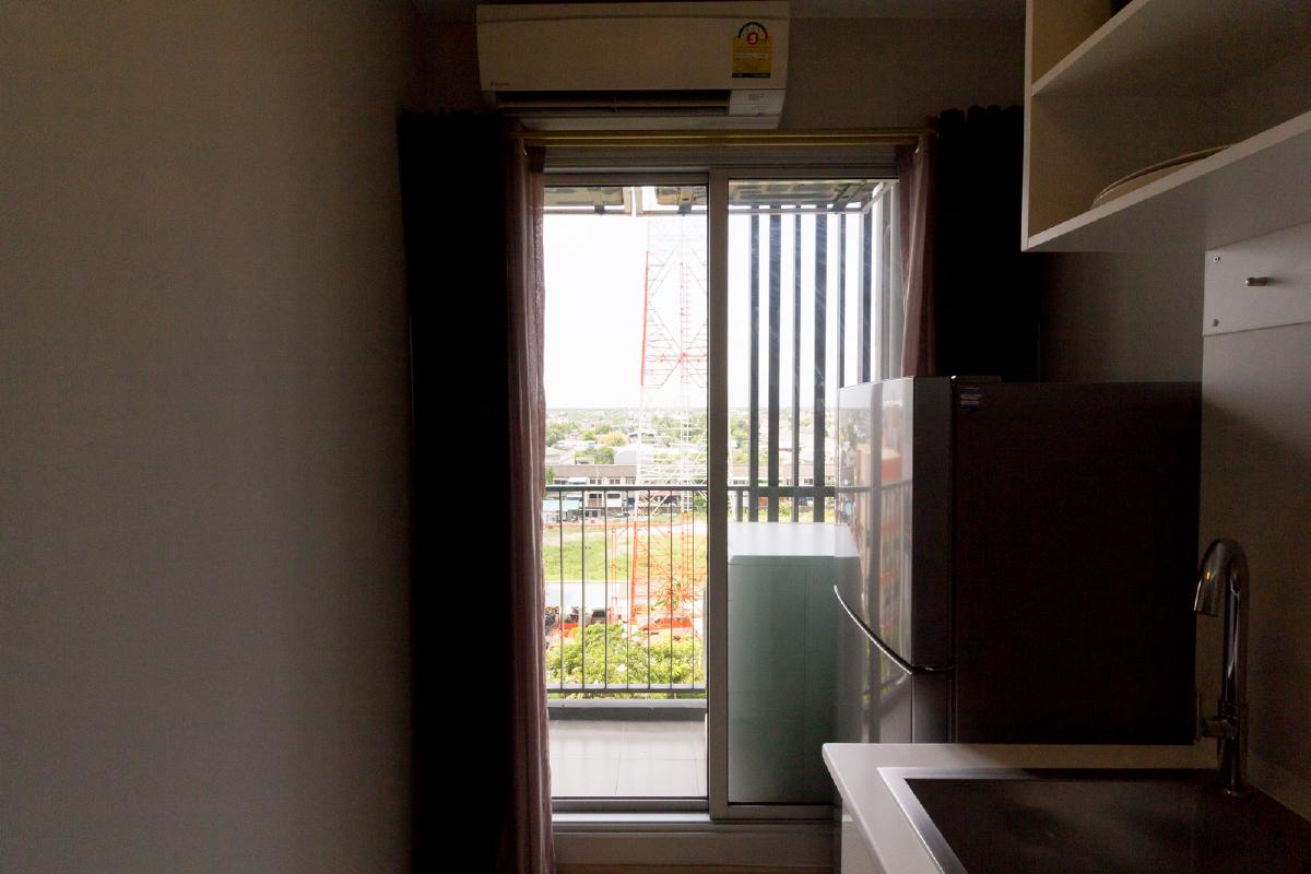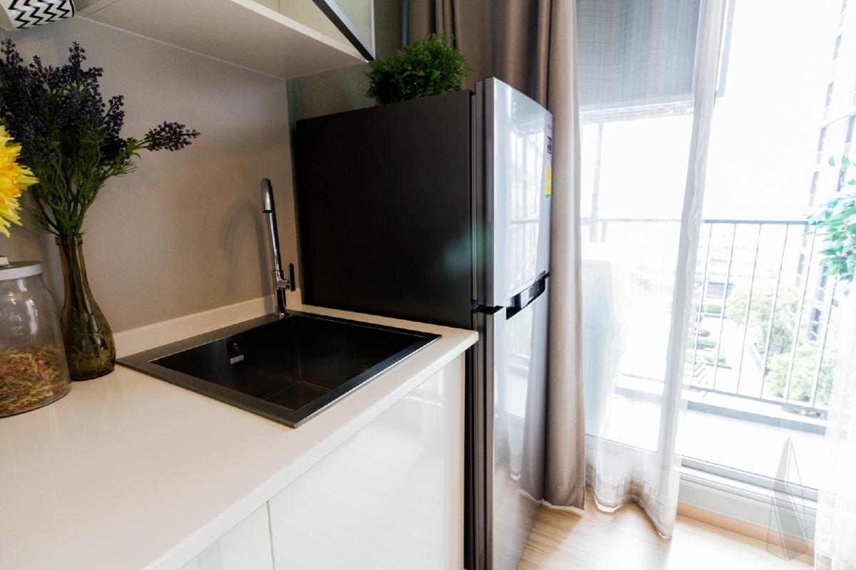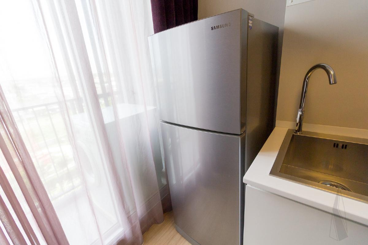 ระหว่างเคาน์เตอร์ครัวแและประตูระเบียงจะเป็นพื้นที่สำหรับวางตู้เย็น ขนาดตู้เย็นในห้องตัวอย่างจะเป็นขนาด 7.4 คิวบิกฟุต ซึ่งก็ยังมีพื้นที่เหลืออยู่บ้าง ถ้าใครอยากได้ตู้ที่ใหญ่กว่านี้ แนะนำให้วัดพื้นที่ไไปก่อนที่จะเลือกซื้อจะดีกว่า