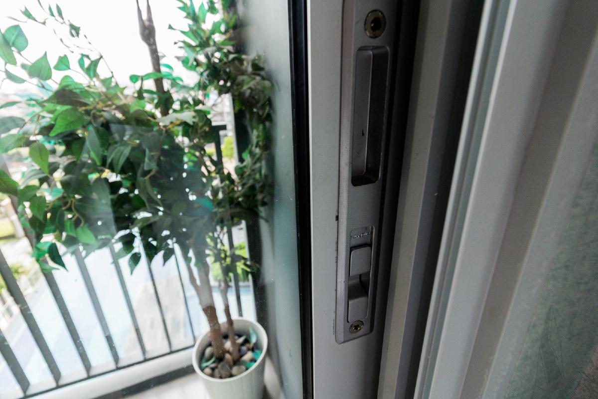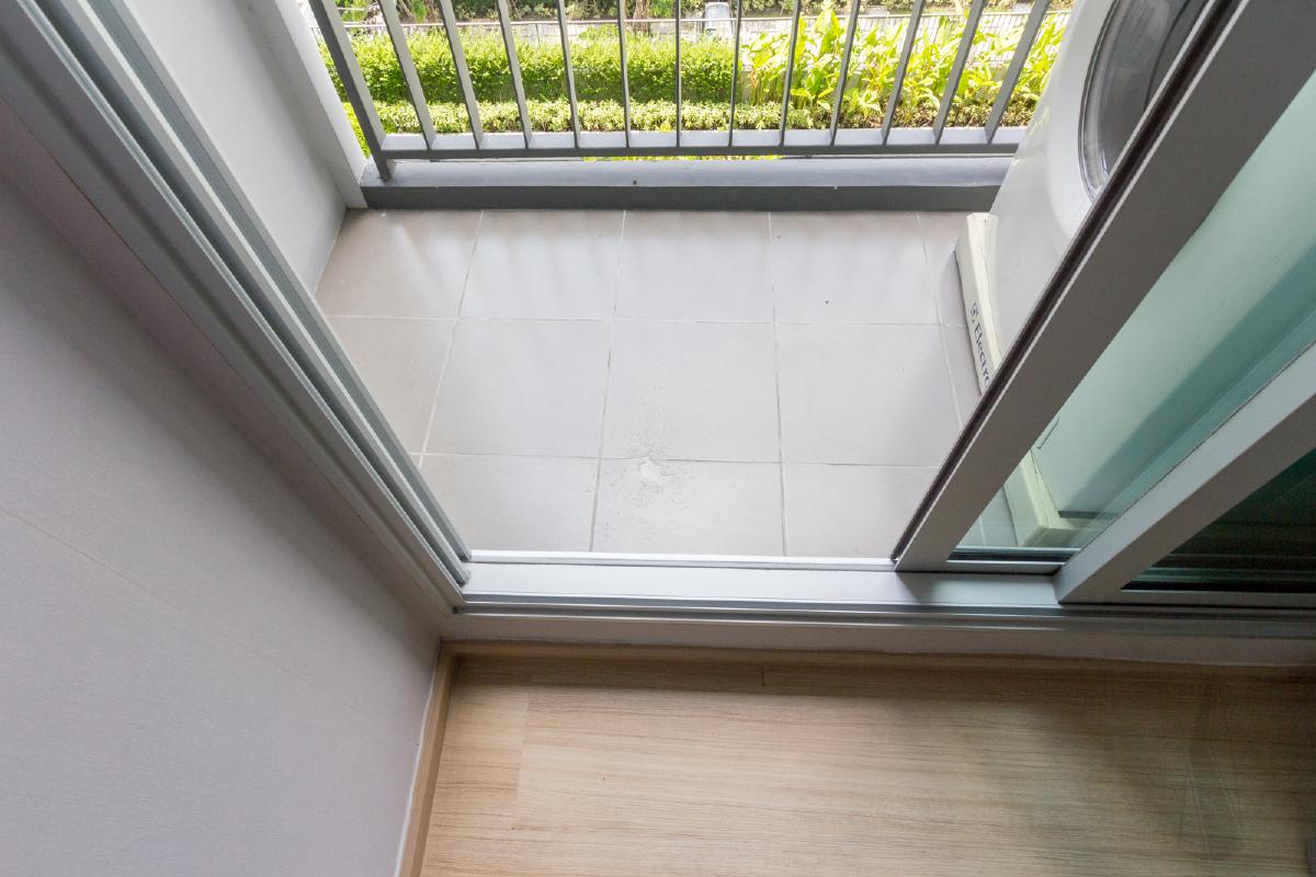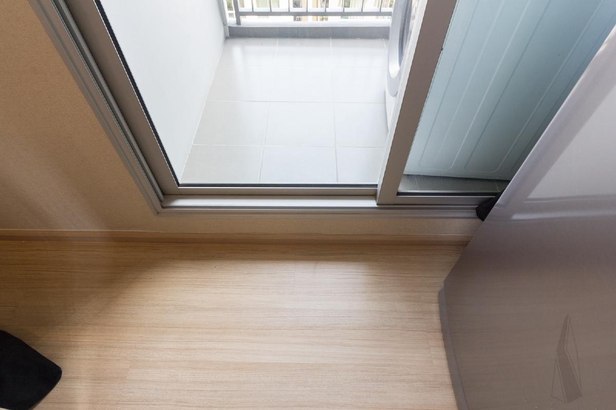 ประตูระเบียงครัวจะเป็นประตูบานเลื่อนแบบมาตรฐาน มือจับเป็นแบบเซาะร่องพร้อมตัวล็อก