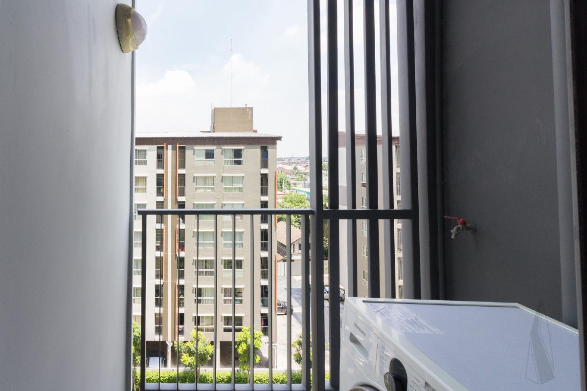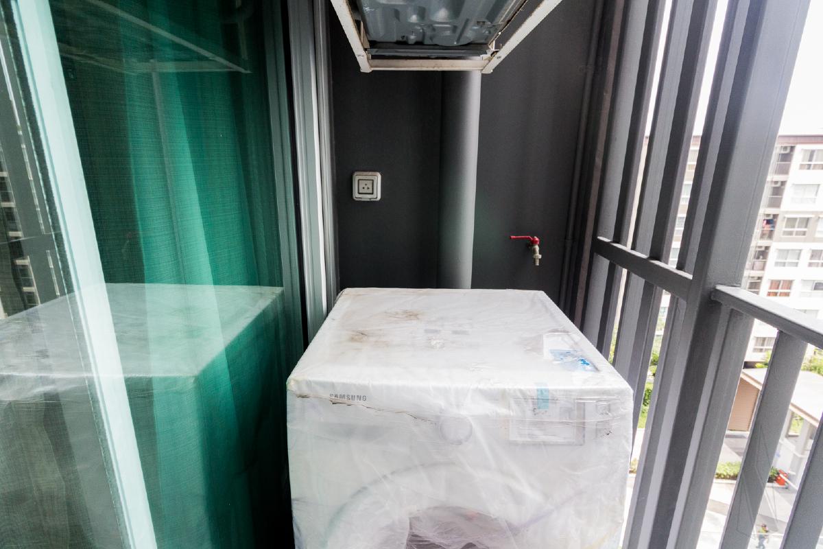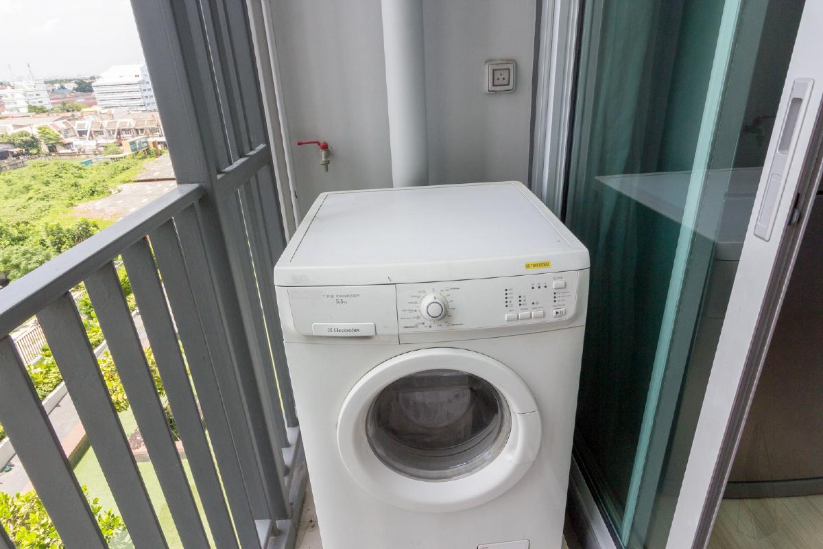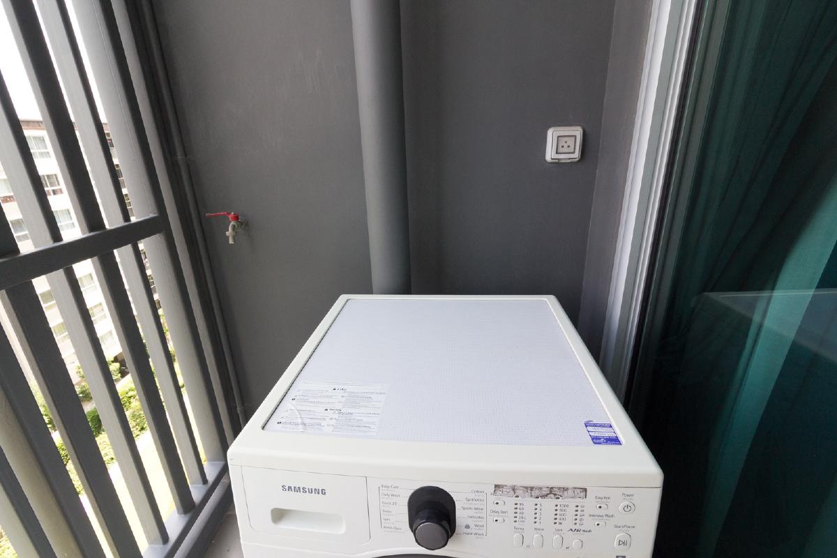 ด้านนอกระเบียงจะมีเครื่องซักผ้าพร้อมกับปลั๊กไฟและก๊อกน้ำ ติดตั้งไว้ใต้คอมเพลสเซอร์แอร์ ไว้รองรับสำหรับการซักผ้า