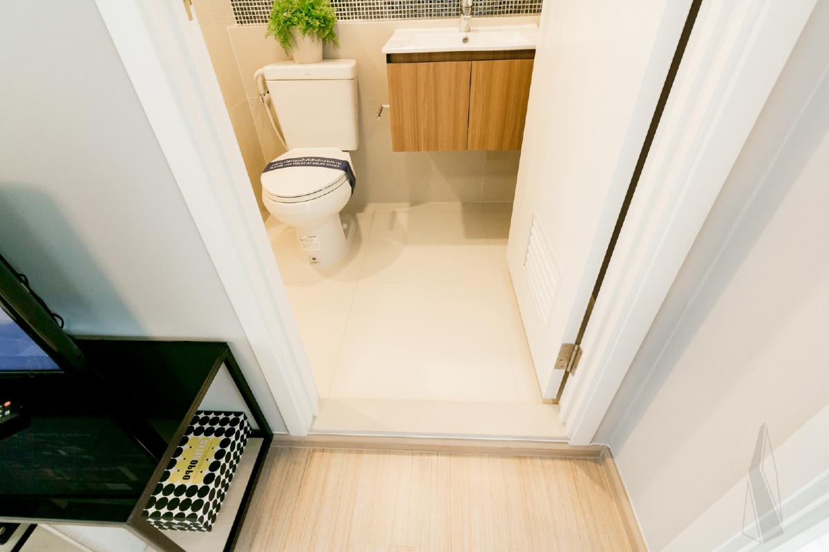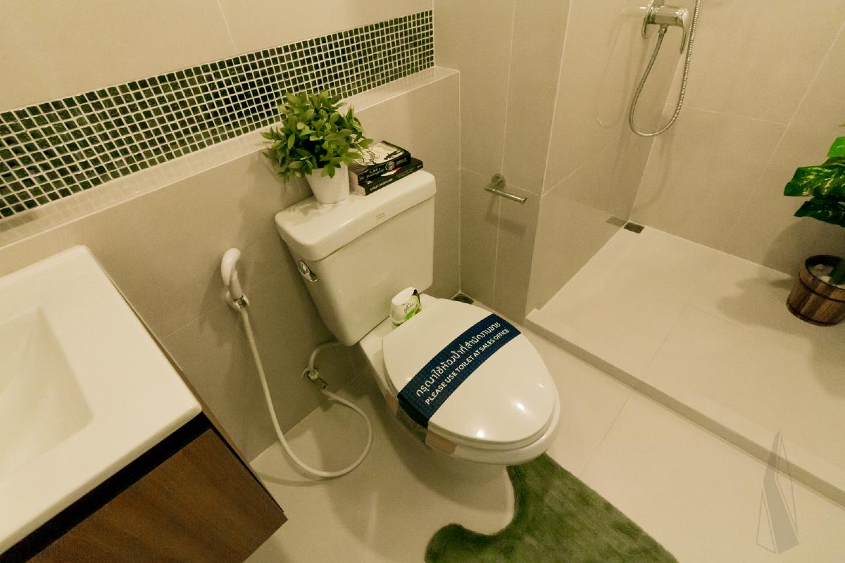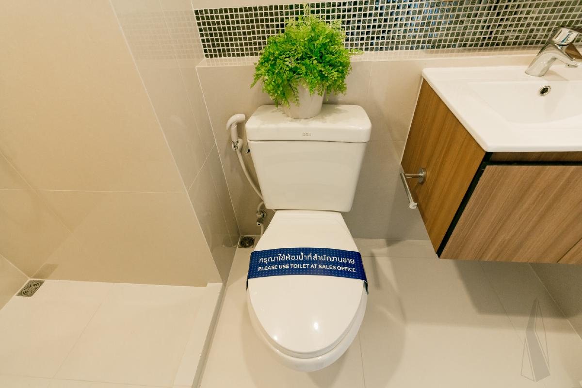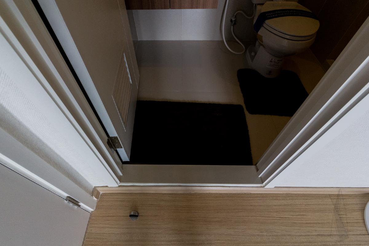 ตรงข้ามประตูระเบียงจะเป็นห้องน้ำ ประตูห้องน้ำเป็น UPVC สีขาว มีบานเกร็ดด้านล่างเพื่อระบายกลิ่น ทางโครงการแยกโซนเปียกกับโซนแห้งมาให้เรียบร้อย เพื่อให้ง่ายต่อการทำความสะอาด