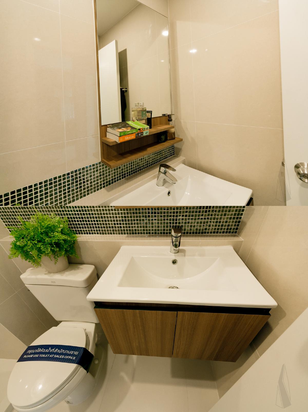 อ่างล้างหน้าอยู่ชิดผนัง ติดตั้งมาแบบแขวนพร้อมกระจกเงา ด้านข้างเป็นโถสุขภัณฑ์ ผลิตภัณฑ์ทั้งหมดจะเป็นของ American Standard