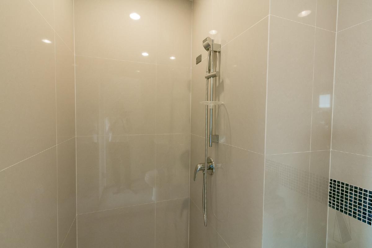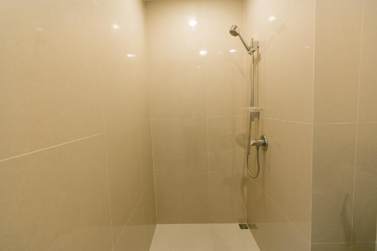 สำหรับโซนเปียกจะไม่ได้ทำการกั้นพาร์ทิชันมาให้ แต่สามารถติดตั้งเพิ่มเติมเองได้ ด้านในติดตั้งฝักบัว พร้อมทำระบบสายดินติดเครื่องทำน้ำอุ่นมาให้แล้ว พื้นที่ส่วนอาบน้ำขนาด 80 x 90 ซม. ถือว่า เป็นสัดส่วนที่พอดียืนอาบน้ำได้อย่างไม่รู้สึกอึดอัด