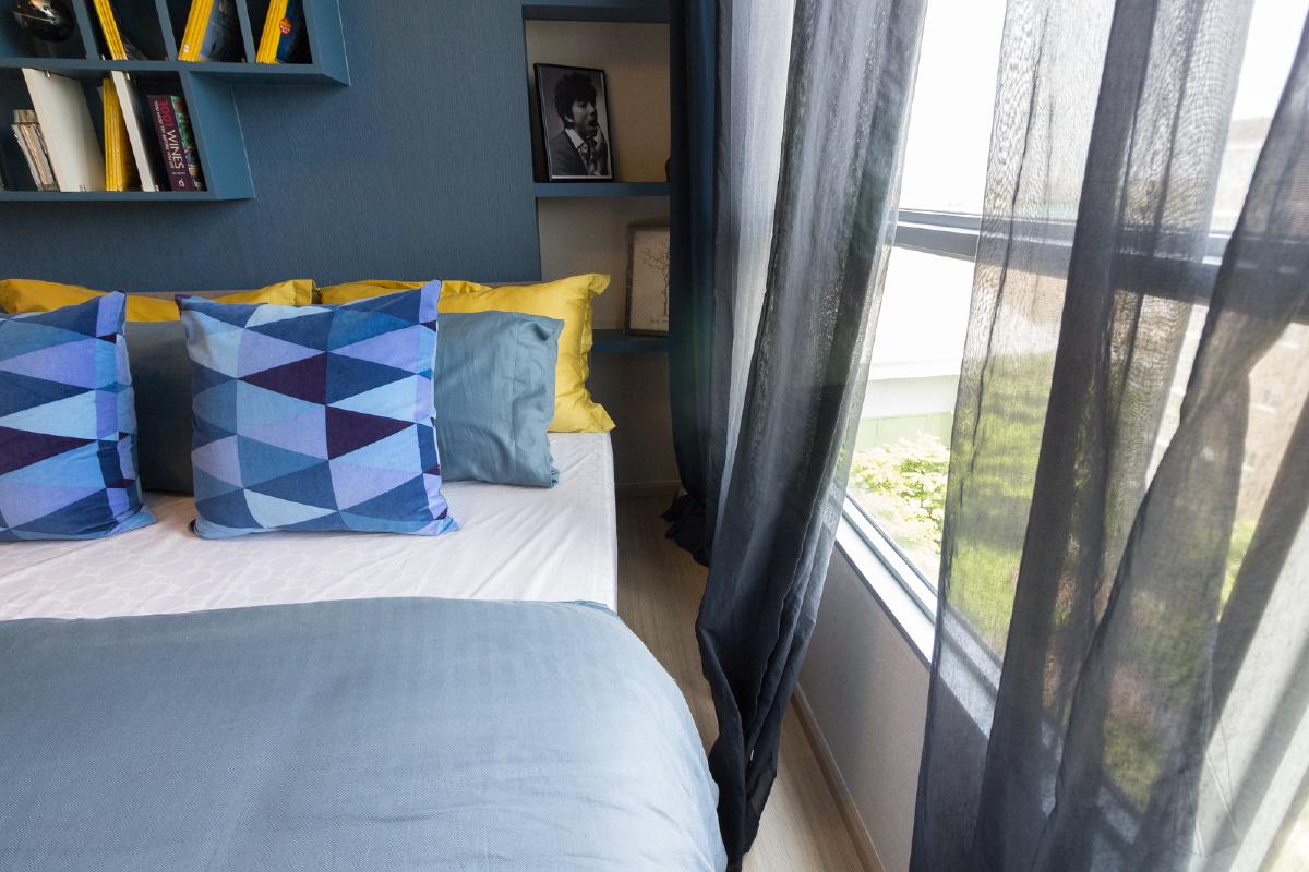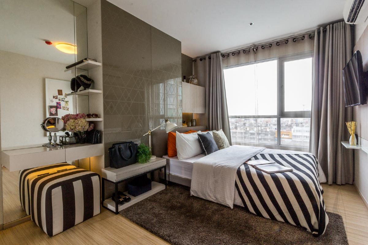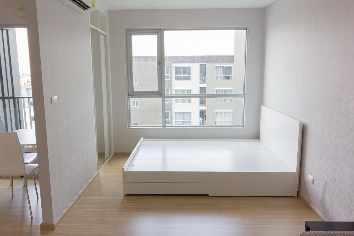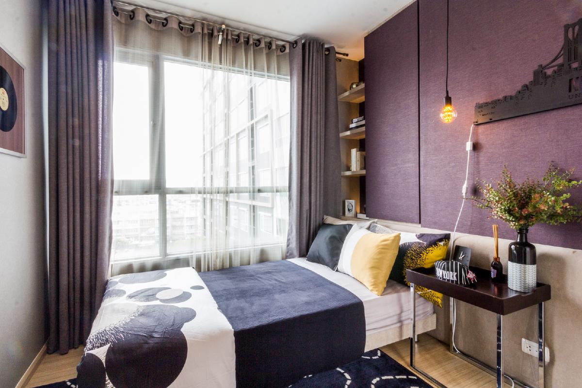 ห้องนอนเล็ก มีเตียงนอนขนาด 3 ฟุตมาให้ การวางเตียงอยู่ชิดริมผนัง ติดกับหน้าต่าง ด้านข้างเตียงสามารถวางโต๊ะเล็กๆ ไว้ตกแต่งได้ แต่ทางโครงการจะแถมโต๊ะข้างเตียงตัวเล็กๆ มาให้อยู่แล้วด้วย
