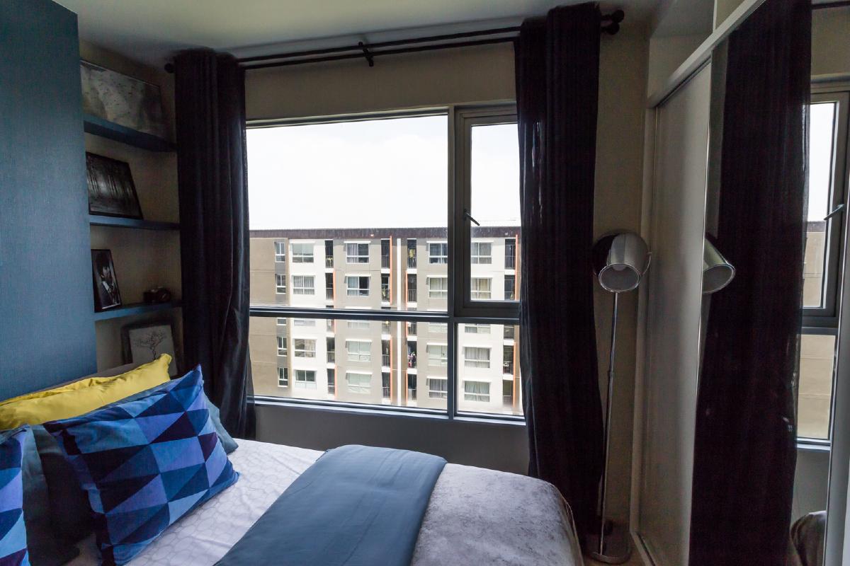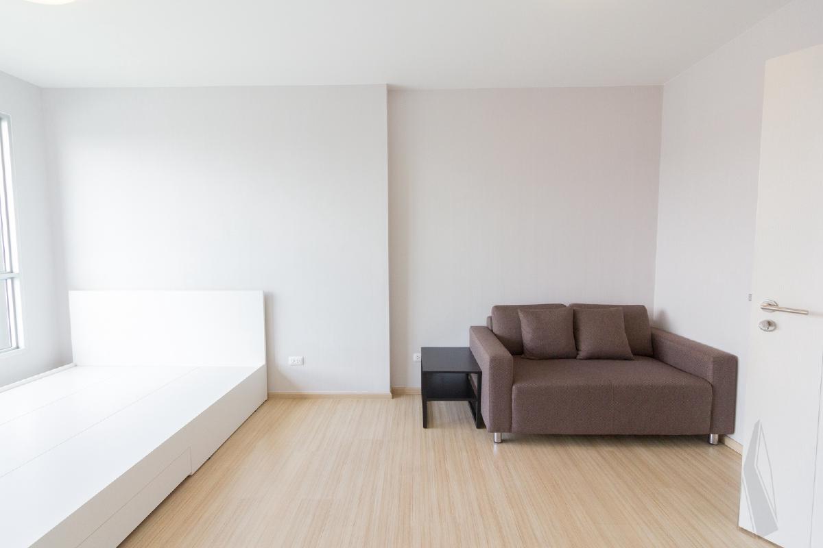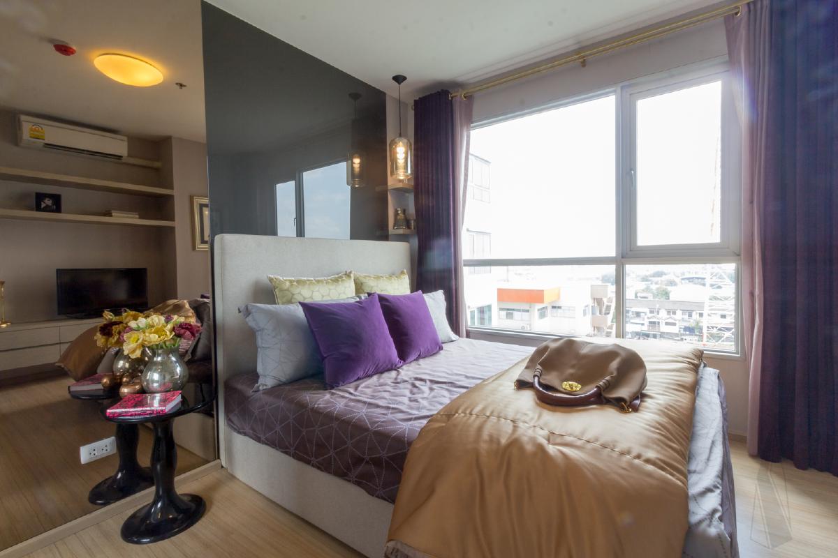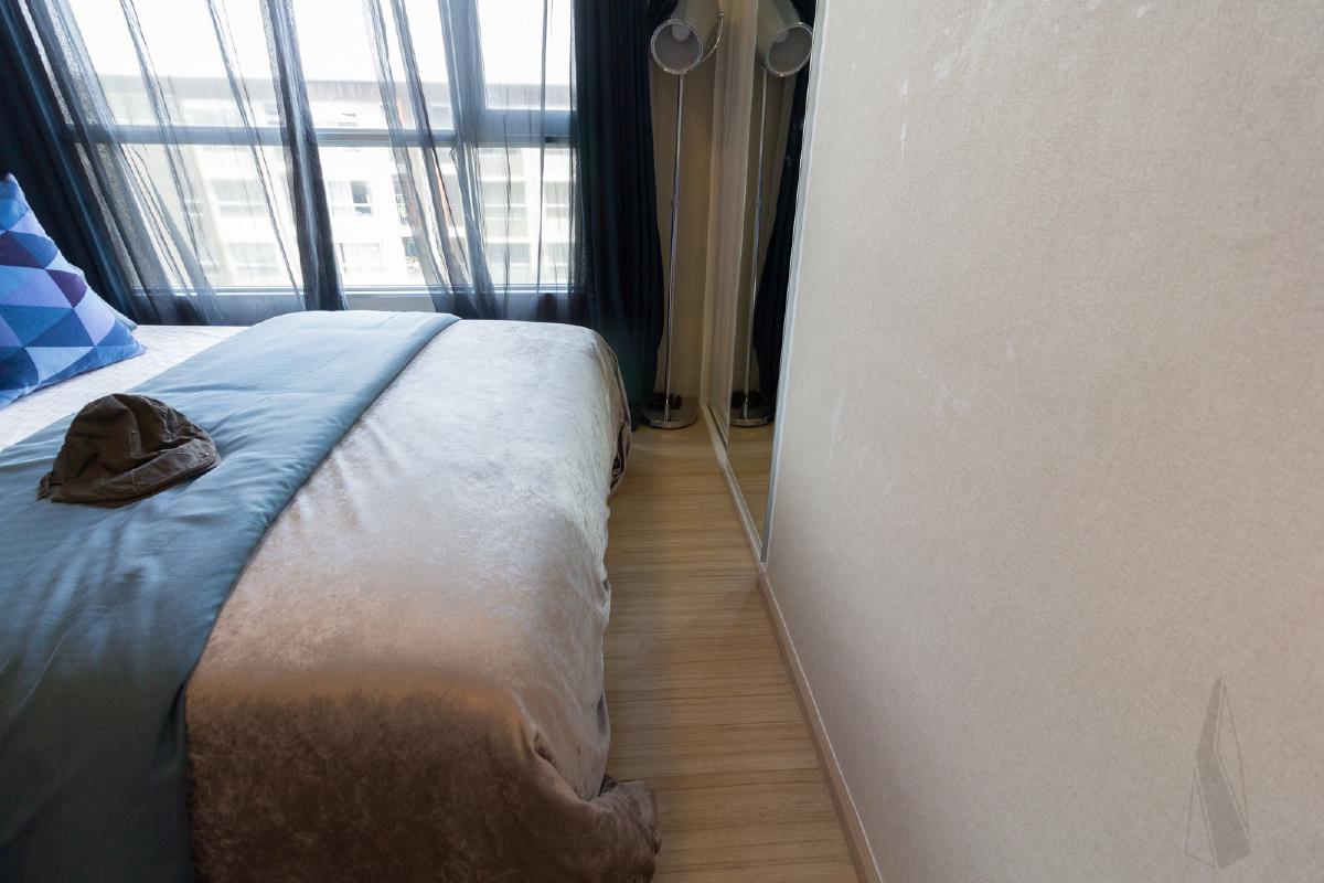 ห้องนอนเล็ก มีเตียงนอนขนาด 3 ฟุตมาให้ การวางเตียงอยู่ชิดริมผนัง ติดกับหน้าต่าง ด้านข้างเตียงสามารถวางโต๊ะเล็กๆ ไว้ตกแต่งได้ แต่ทางโครงการจะแถมโต๊ะข้างเตียงตัวเล็กๆ มาให้อยู่แล้วด้วย