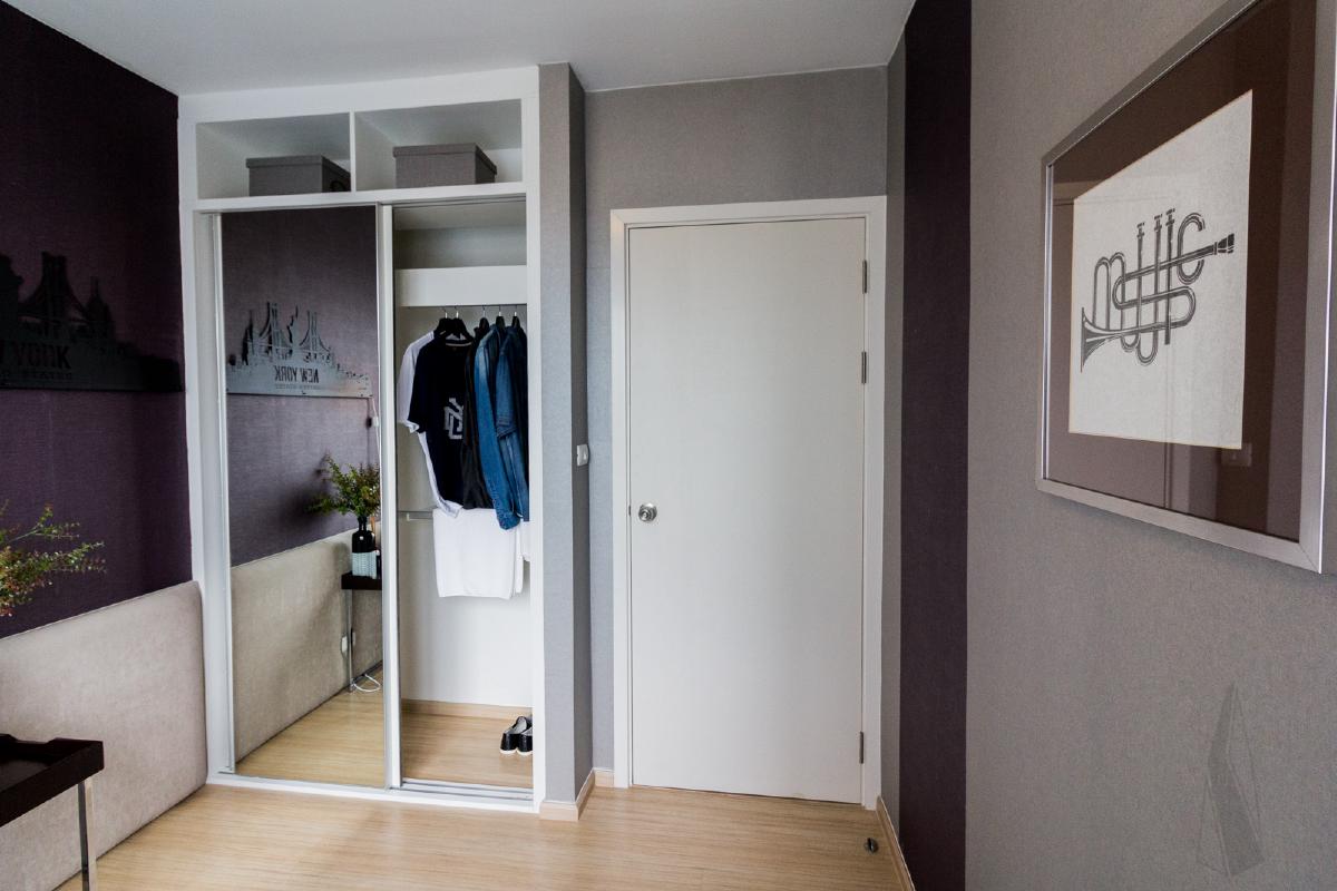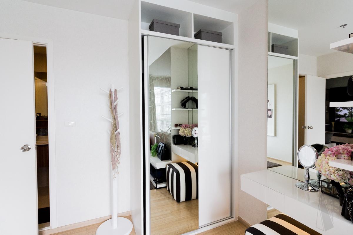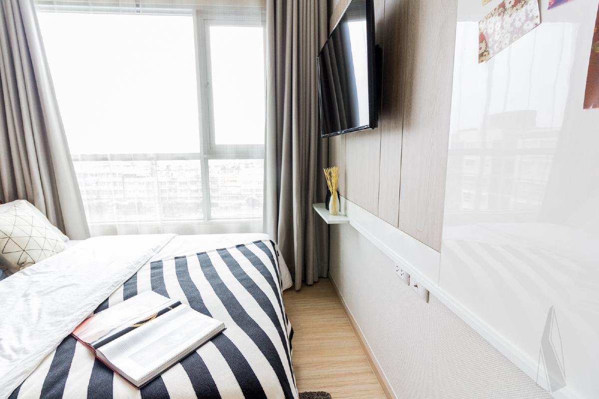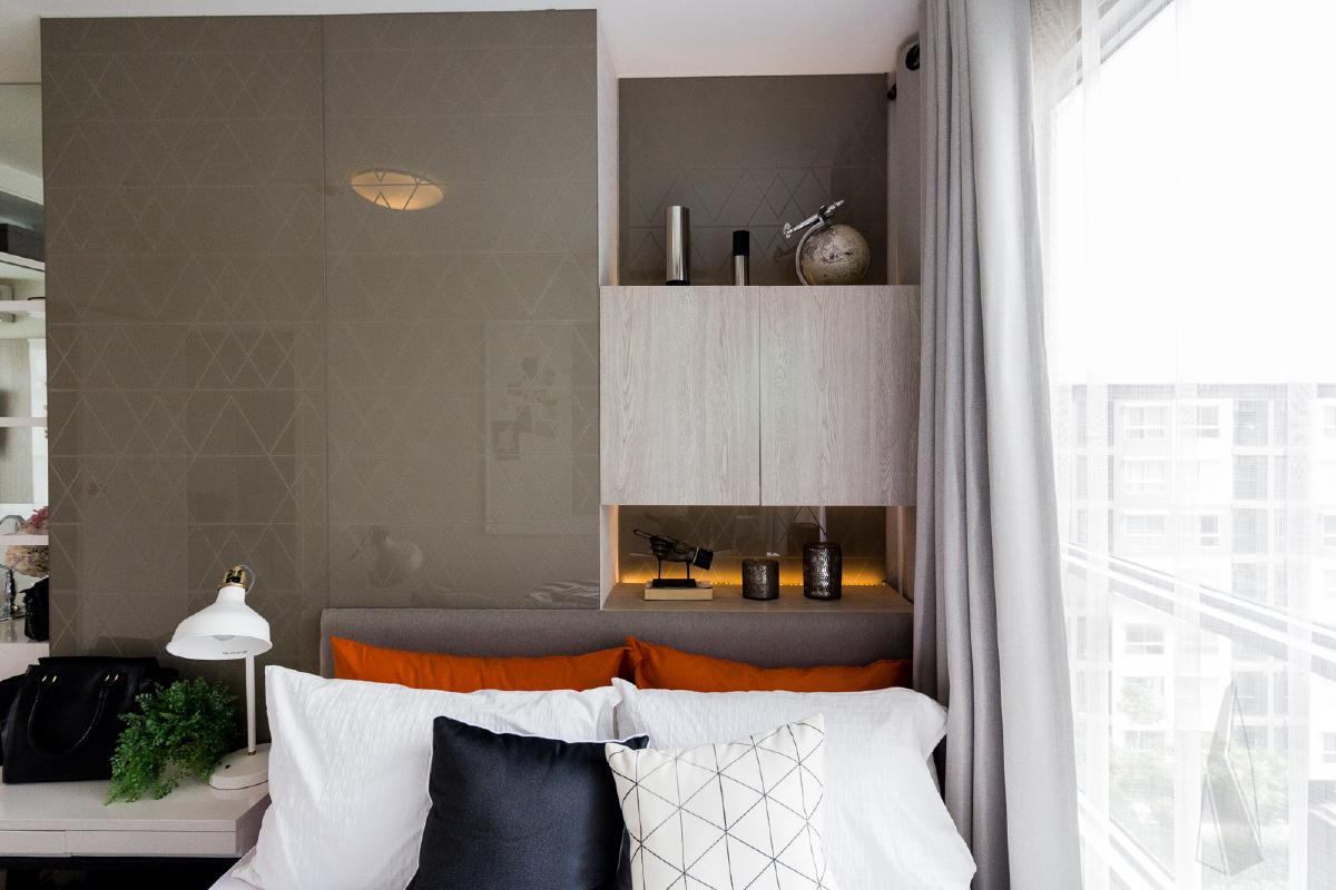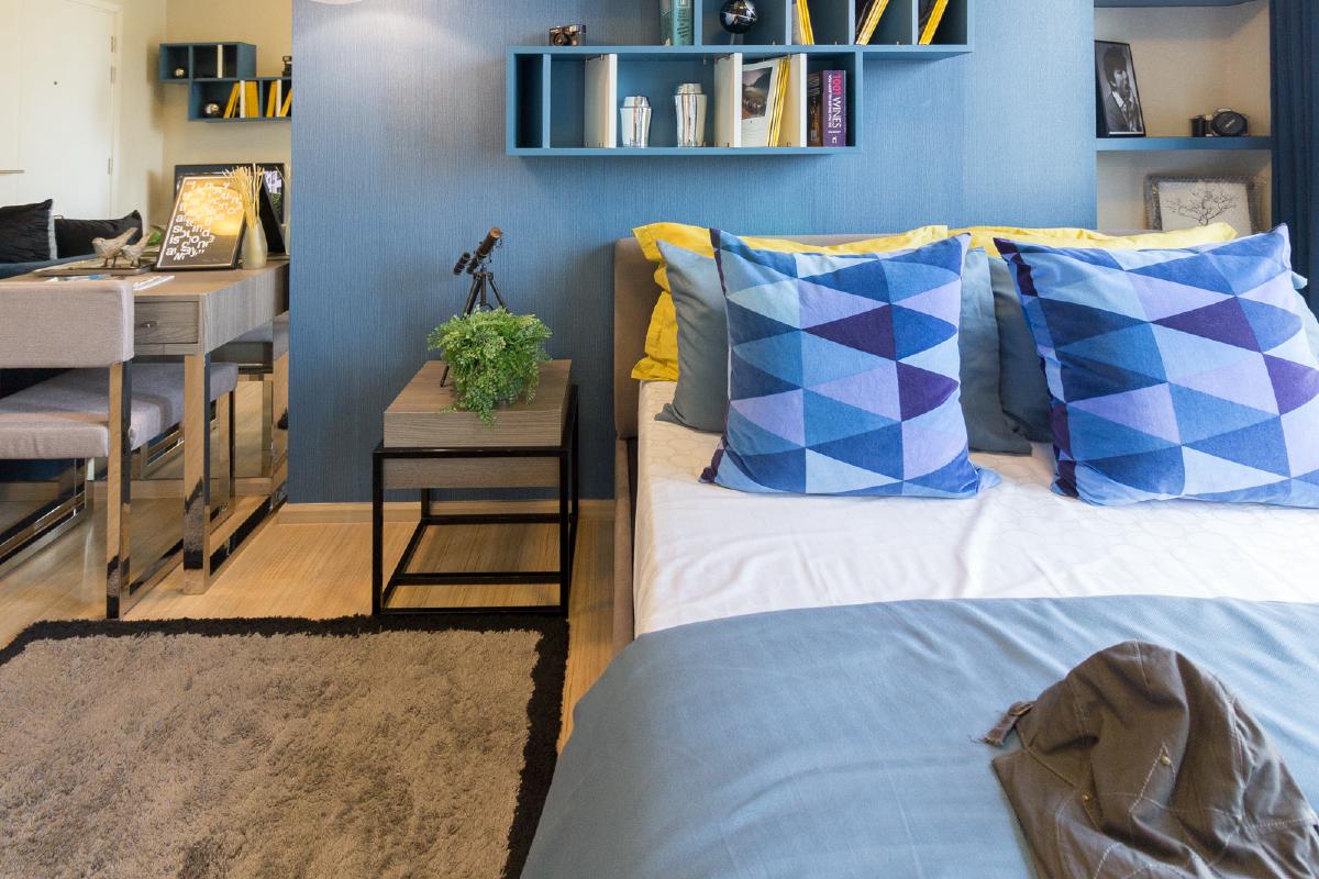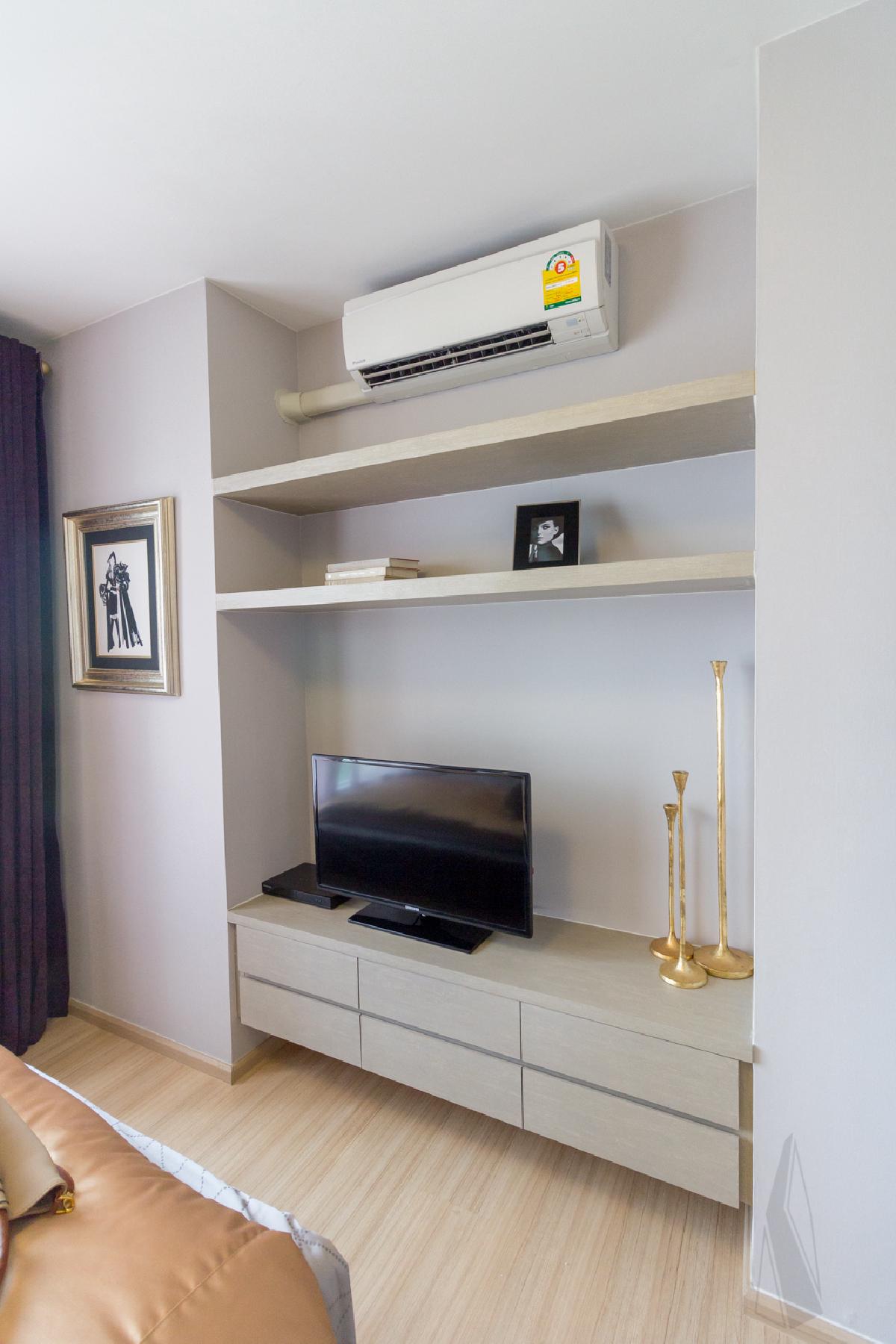 บริเวณปลายเตียงนอน สามารถติดทีวีแบบแขวนได้ เพราะทางโครงการติดตั้งปลั๊กไฟและช่องรัับสัญญาณทีวีมาให้แล้ว