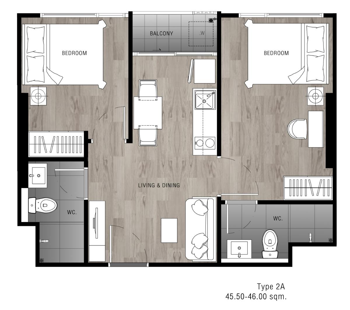 2 Bedrooms พื้นที่ใช้สอย 45 ตร.ม. ราคาเริ่มต้น 2.8 ล้านบาท