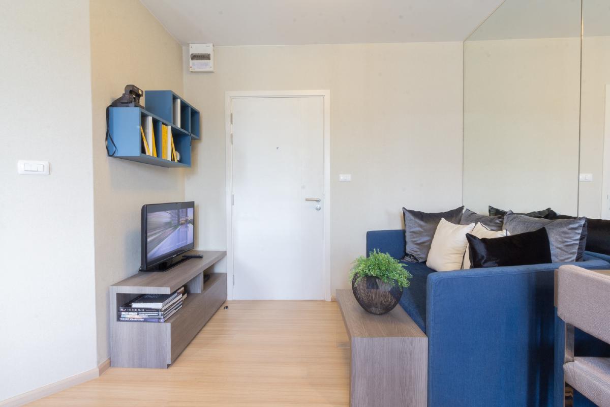 เข้ามาในห้องจะเจอกับห้องนั่งเล่น โซฟาขนาดนั้งได้สองคน อยู่ห่างจากชั้นวางทีวี 2.5 เมตร สามารถชมทีวีขนาด 42 นิ้วได้กำลังดี