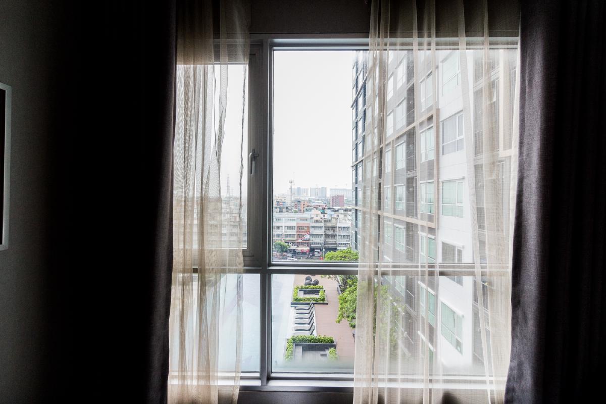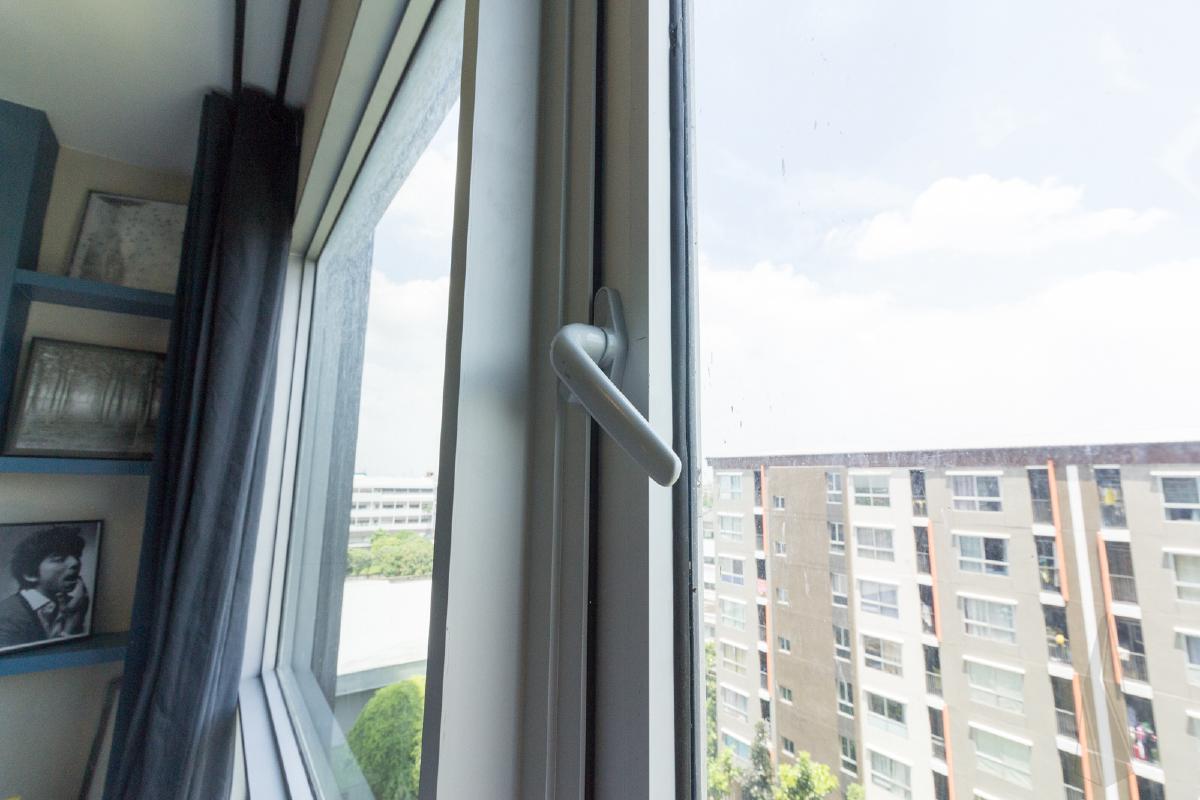 หน้าต่างห้องกว้างเต็มผนัง เป็นบานฟิกซ์ผสมบานผลัก แต่ขนาดหน้าต่างค่อนข้างเล็กไปสักหน่อย สำหรับใช้เพื่อระบายอากาศ