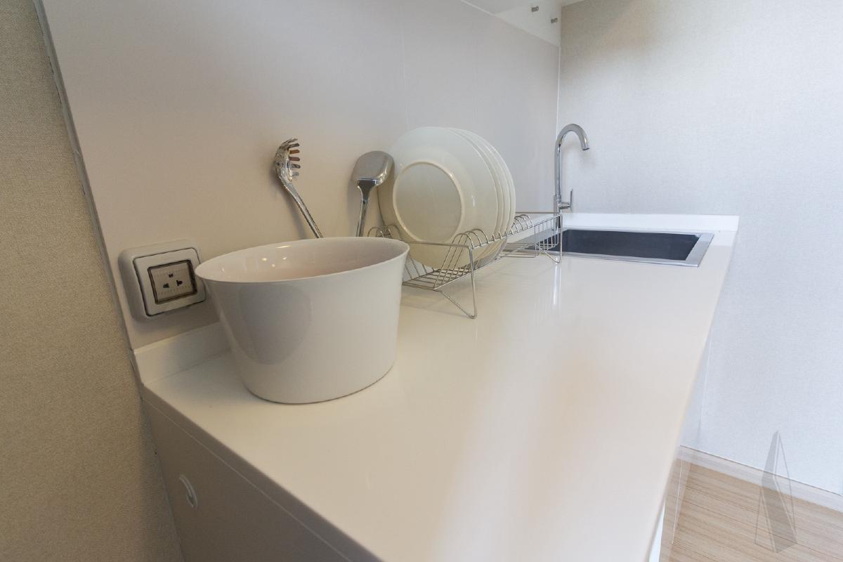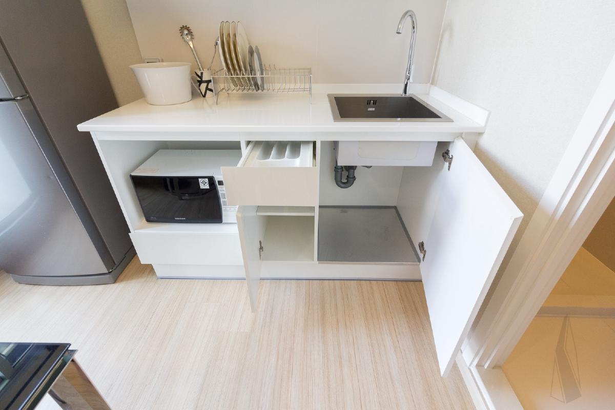 ท็อปของเคาน์เตอร์ครัวจะเป็นหินสังเคราะห์สีขาว เช็ดล้างทำความสะอาดได้ง่าย ด้านล่างมีช่องวางไมโครเวฟ ลิ้นชักเก็บช้อน-ส้อม พร้อมตู้เก็บของใต้อ่างล้างจาน ซึ่งใช้สำหรังานซ่อมบำรุงอ่างด้วย