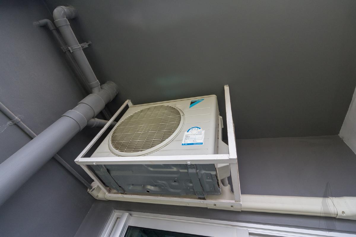 เหนือเครื่องซักผ้าเป็นคอมเพรสเซอร์แอร์แบบแขวน หันหน้าออกด้านนอกระเบียง
