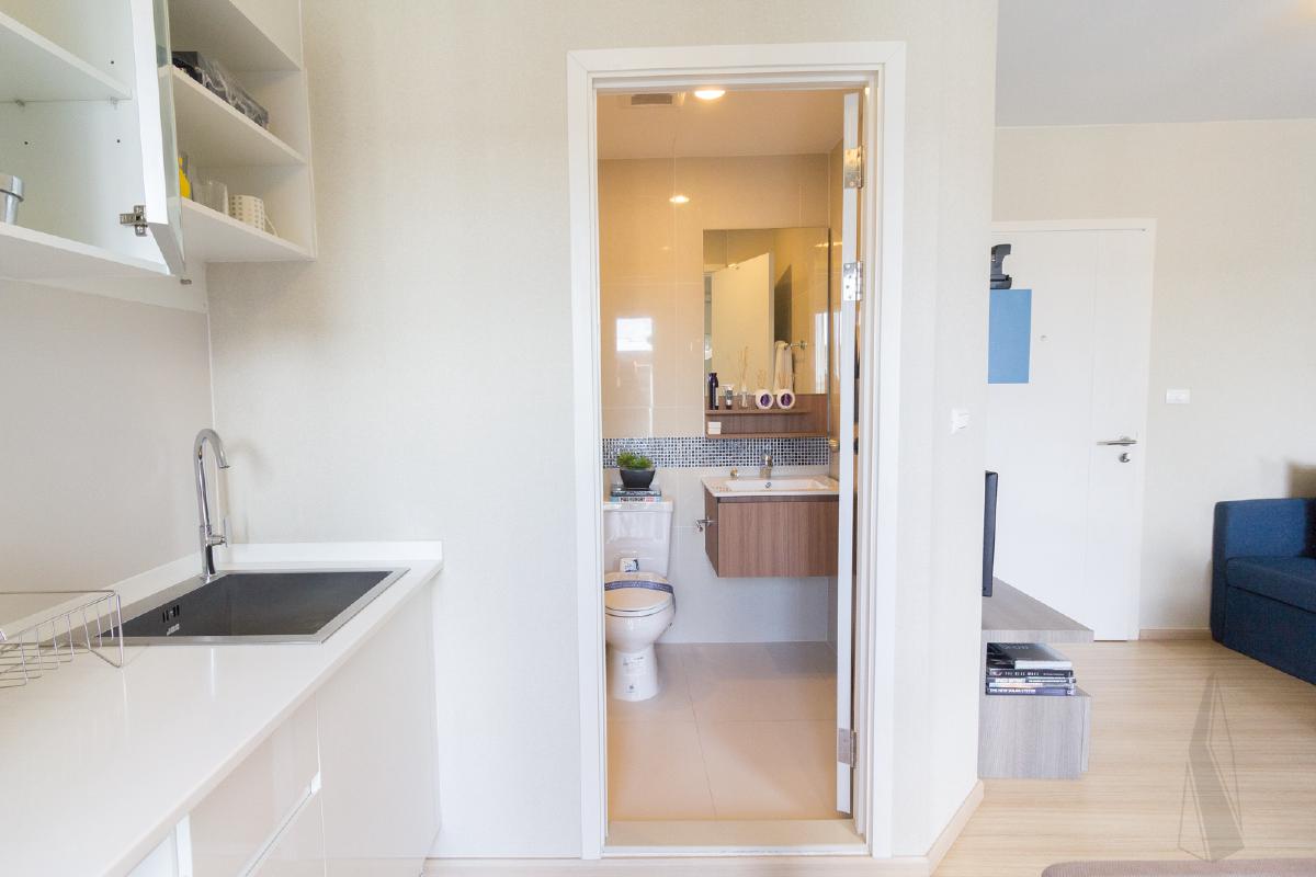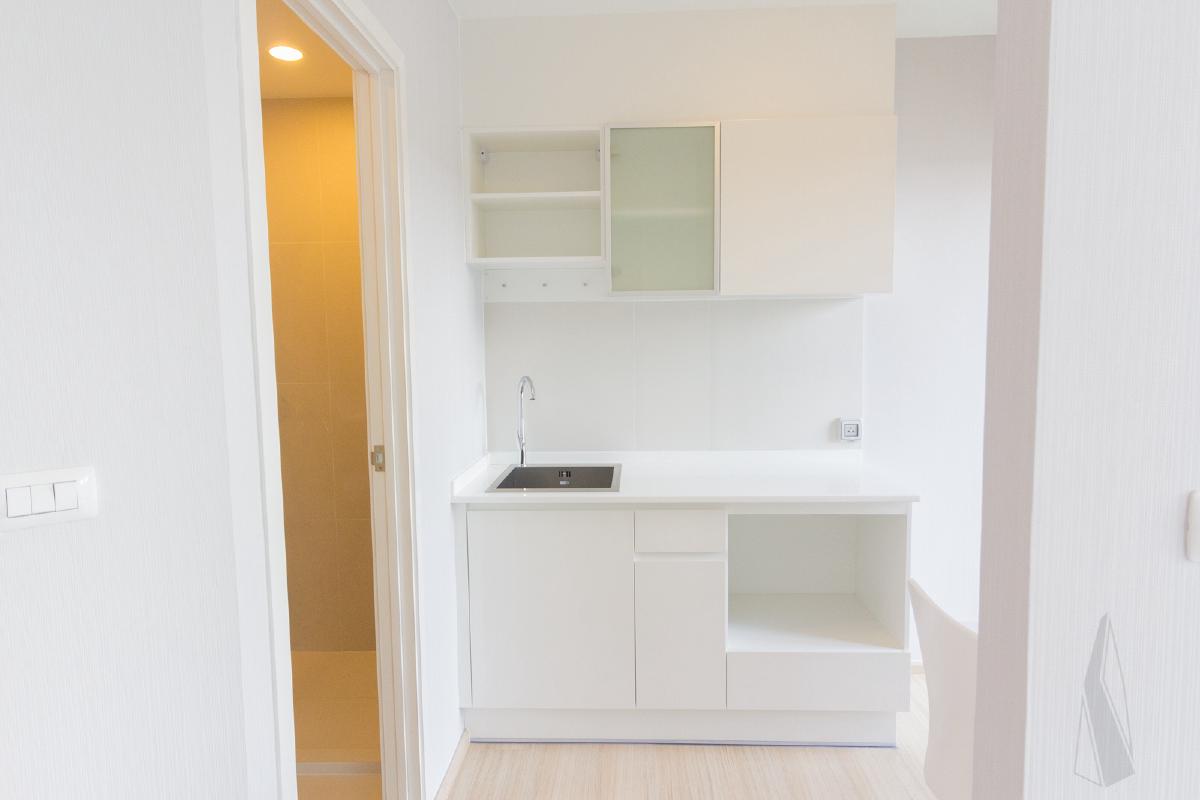 ตรงข้ามกับห้องนอนจะเป็นห้องครัว แต่น่าเสียดายที่ผนังห้องน้ำทำออกมาแบบปาดมุม ทำให้ติดพาร์ทิชันห้องครัวเพิ่มเติมไม่ได้