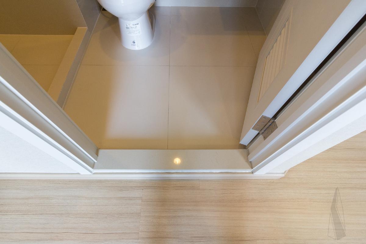 ห้องน้ำจะถูกยกพื้นธรณีให้สูงขึ้นกว่าพื้นห้องปกติ ป้องการน้ำไหลออก วัสดุธรณีเป็นหินเทียมดูแข็งแรงดี ส่วนด้านในห้องน้ำจะเป็นพื้นกระเบื้องขนาด 60x60 ซม. กันลื่นได้ดี