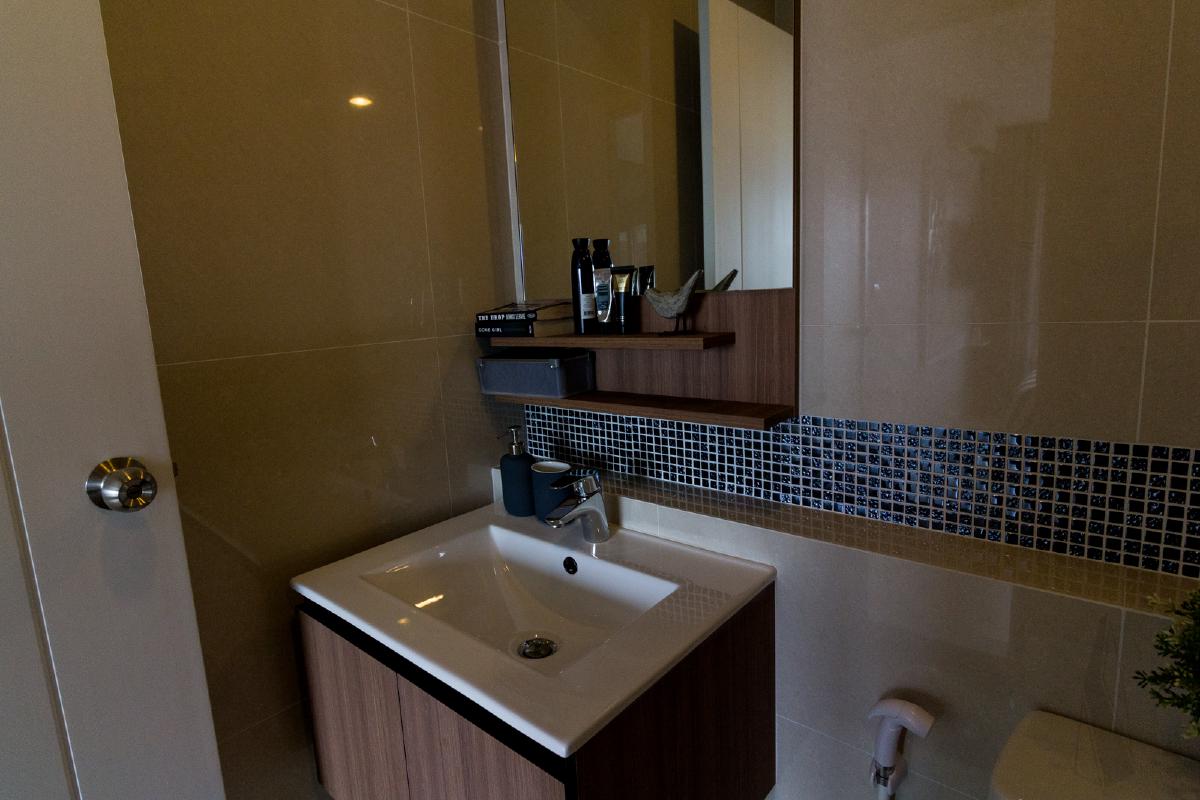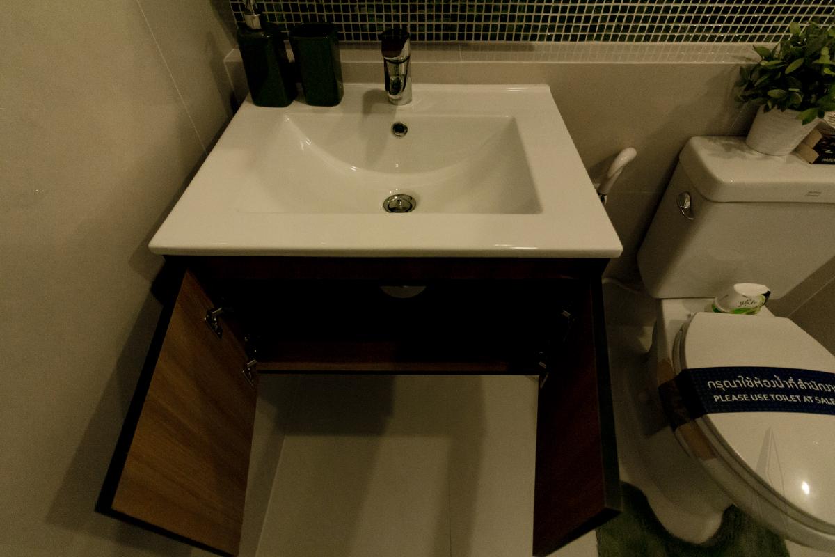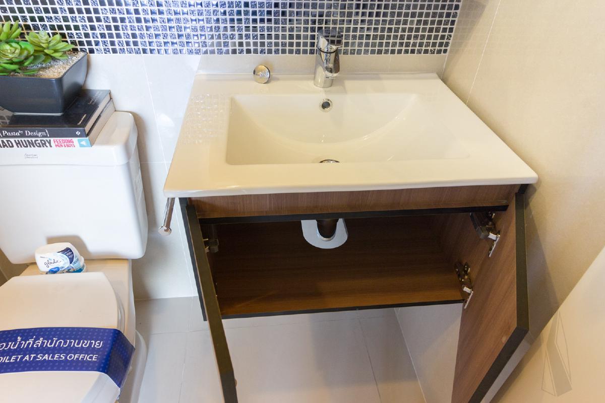 อ่างล้างหน้าจะเป็นอ่างแบบแบบแขวนผนัง พร้อมกับมีชั้นเก็บของอยู่ด้านล่างแบบประตูบานเปิดคู่ สามารถเก็บอุปกรณ์ทำความสะอาดห้องน้ำได้