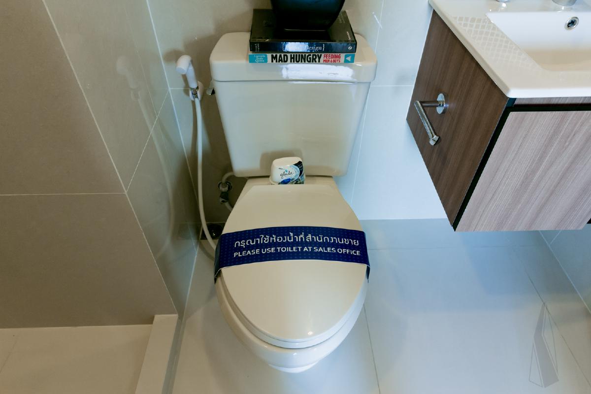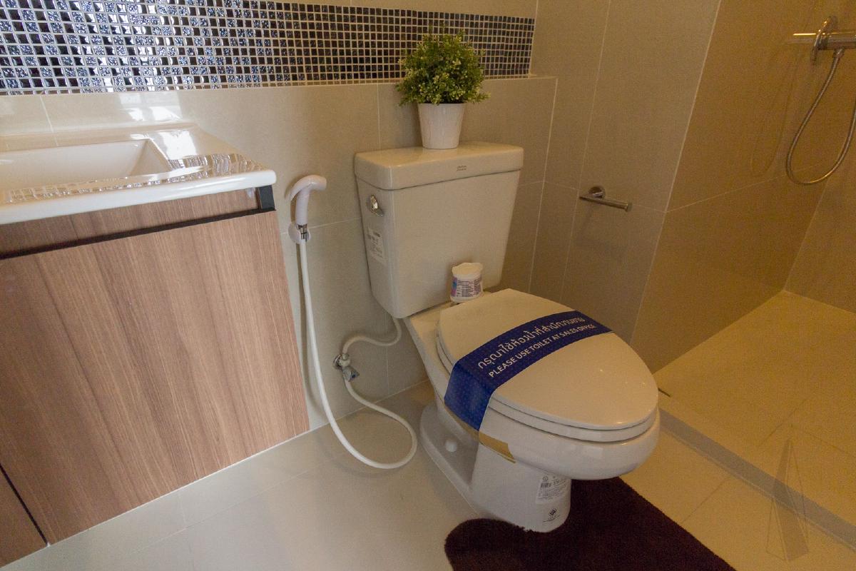 สุขภัณฑ์เป็นของ American Standard แบบมาตรฐานมาพร้อมกับสายฉีดชำระ วาวล์ต่อน้ำใช้ท่อเดียวกัน เวลาซ่อมแซมจะลำบากหน่อย เพราะไม่สามารถใช้สุขภัณฑ์ชิ้นใดใช้ได้เลย
