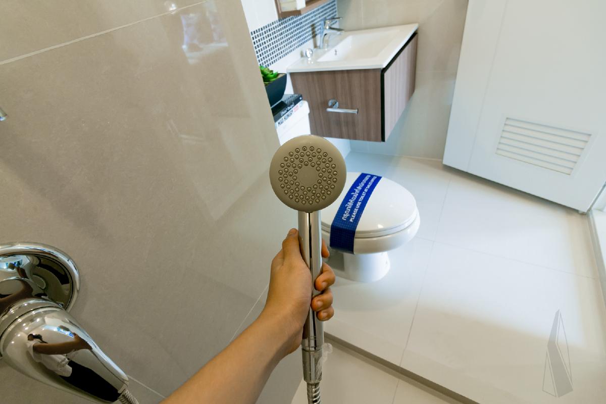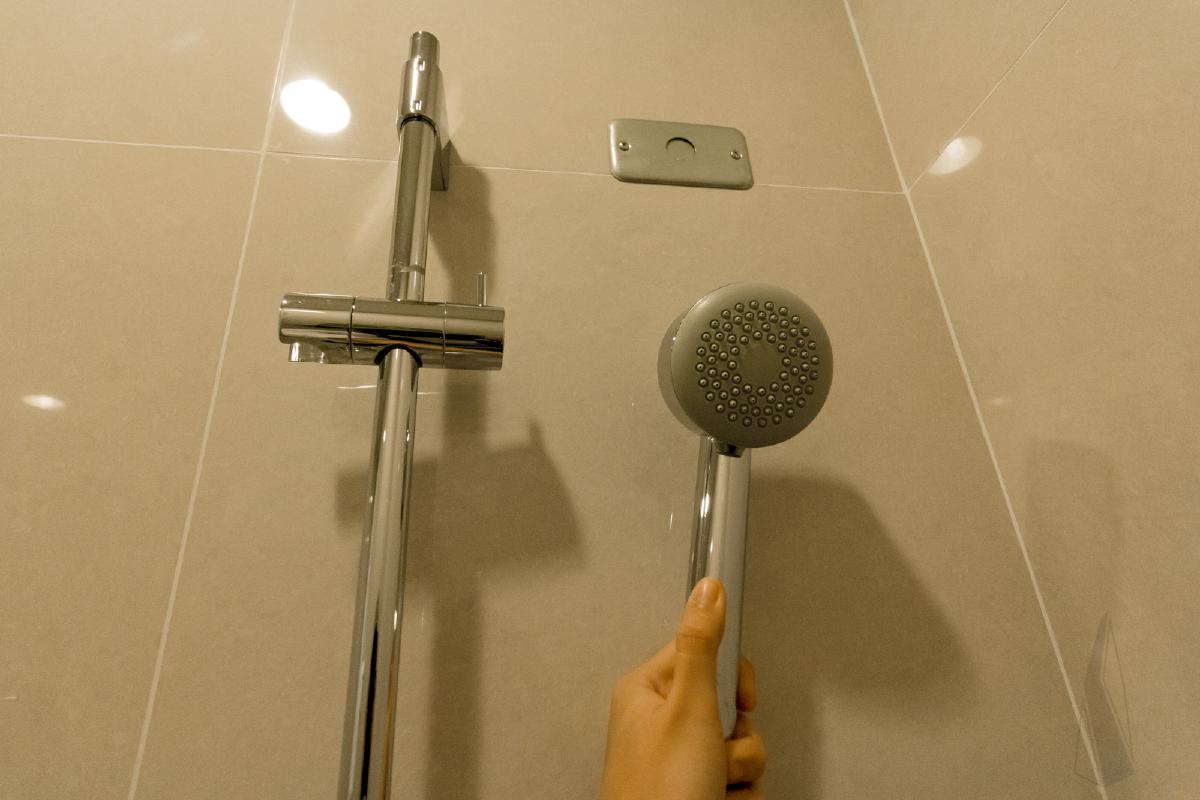ฝักบัวเป็นแบบ Hand Shower สามารถปรับระดับความสูงได้ ด้านบนมีจุดสำหรับติดตั้งเครื่องทำน้ำอุ่นมาให้เรียบร้อย