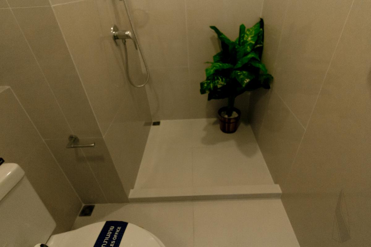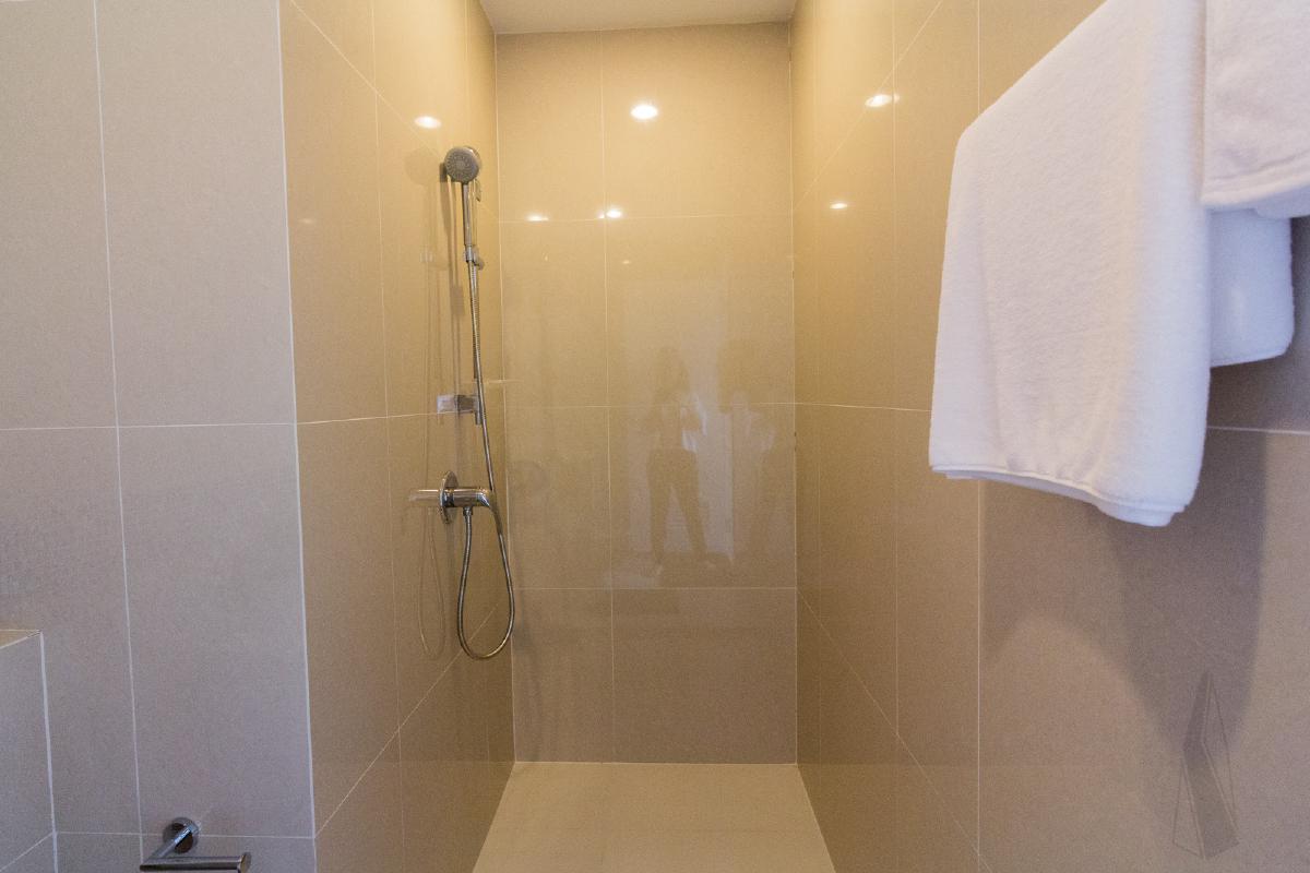 มุมอาบน้ำมีการยกธรณีกั้นแยกเพื่อป้องกันน้ำไหลออกมายังบริเวณโซนแห้ง แต่ทางที่ดีกั้นพาร์ทิชันกระจกไปเลยจะทำให้ทำความสะอาดได้ง่ายกว่า