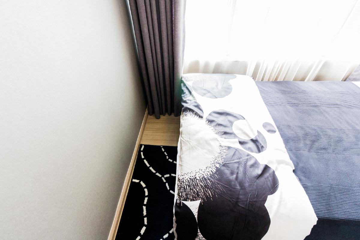 เตียงที่ได้จะเป็นเตียง Queen Size ขนาด 5 ฟุต นอนสองคนแล้วใกล้ชิดกันดี เตียงจะวางไว้ใกล้กับหน้าต่าง สำหรับใครที่อยากให้ห้องนอนมืดสลัว เหมาะกับการพักผ่อนมากขึ้น แนะนำให้ติดผ้าม่านสองชั้นเพิ่ม เวลาเช้าก็เปิดออกรับแสงแดด ช่วยในเรื่องประหยัดไฟ ส่วนเวลากลางคืนก็ปิดม่านไว้เพื่อความเป็นส่วนตัว และสร้างบรรยากาศให้เหมาะกับการนอนหลับ