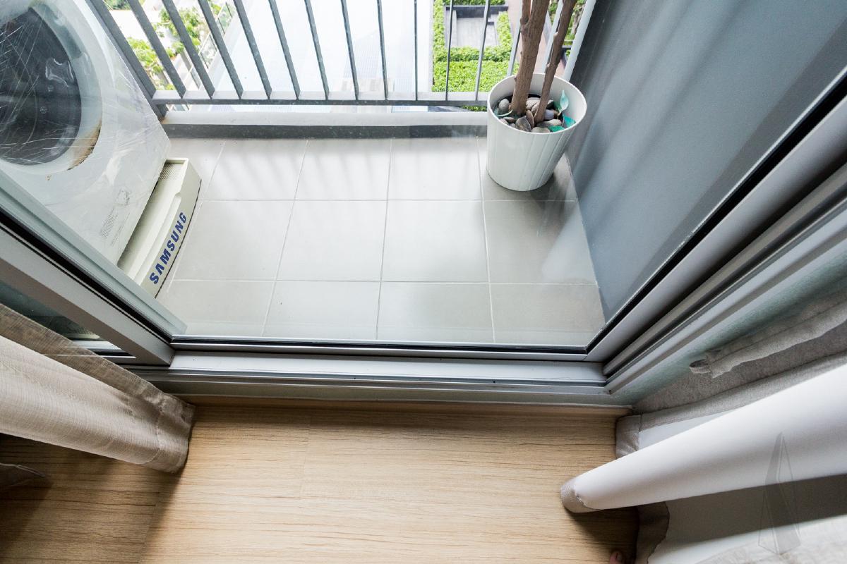 พื้นที่ระเบียงจะปูด้วยกระเบื้องเซรามิก ขนาด 30x30 ซม. ยกธรณีประตูให้สูงขึ้นเพื่อป้องกันน้ำฝนจากด้านนอกไหลย้อนเข้ามาภายในห้อง