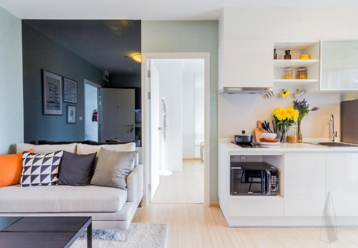 ด้านเลย์เอาท์ของห้อง จะเน้นฟังก์ชันการใช้งานที่เชื่อมต่อถึงกันทำให้ห้องดูกว้างมากขึ้น แต่ถ้าใครต้องการความเป็นส่วนตัวก็สามารถกั้นพาร์ทิชันแยกส่วนห้องนอนออกไปก็ได้ ด้านครัวจะได้มาเป็นระบบเปิด อยู่ติดกับระเบียงซักล้าง และห้องน้ำ ตรงนี้อาจจะช่วยระบายกลิ่นและควันจากการทำอาหารได้บ้าง แต่ก็มีโอกาสที่กลิ่นจะฟุ้งกระจายลอยไปติดเฟอร์นิเจอร์ภายในห้องอยู่ แนะนำให้ติดเครื่องดูดควันเพิ่ม หรือเลี่ยงการทำอาหารประเภทผัดหรือทอดภายในห้อง