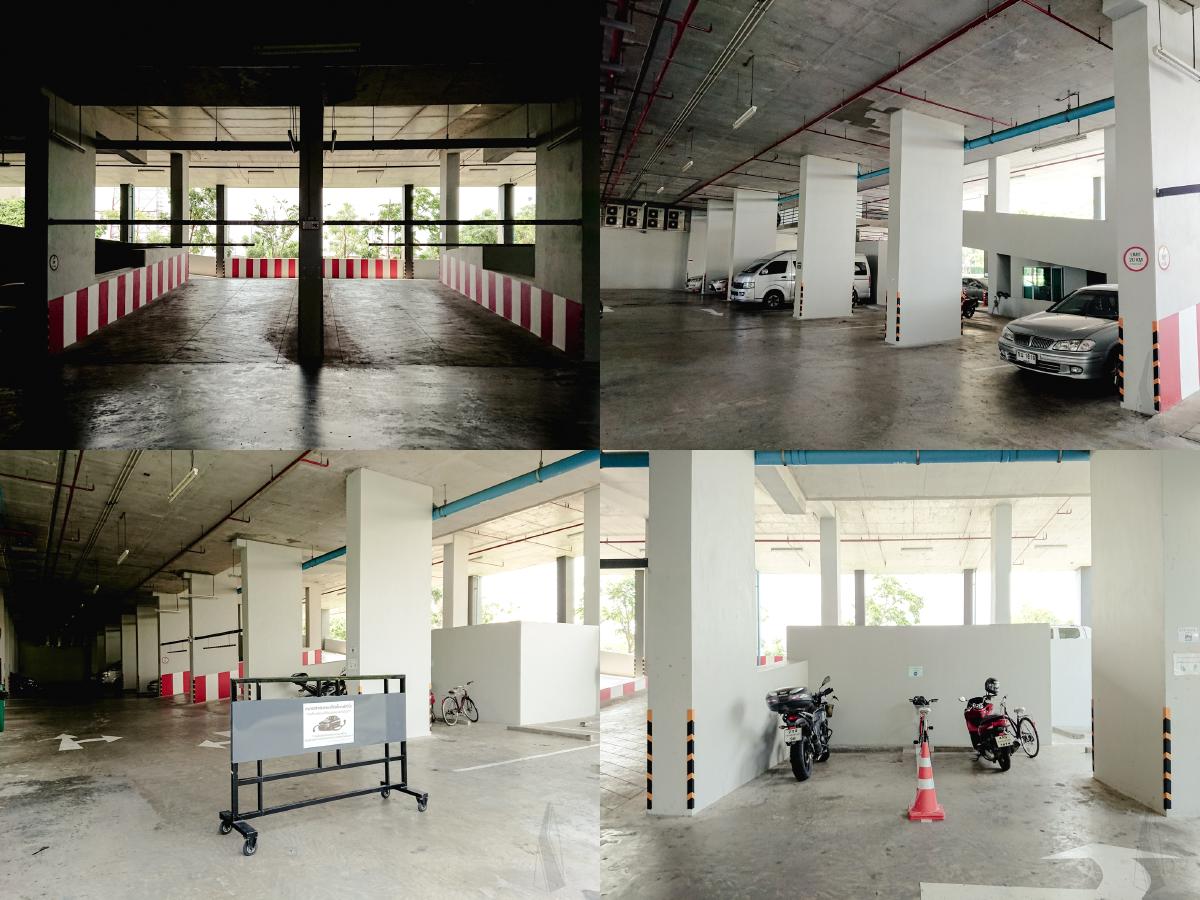 พื้นที่ลานจอดรถจะมีให้ตั้งแต่ชั้น 1-2 แยกส่วนการจอดรถจักรยานยนต์และรถยนต์ออกจากกันเป็นสัดส่วน โดยสามารถจอดรถได้ทั้งหมด 306 คันคิดเป็น 37.55% แบบไม่รวมการจอดซ้อนคัน แต่ถ้ารวมการแบบจอดซ้อนคัน จะคิดเป็น 45% นอกจากนี้ด้านหลังยังมีลานจอดรถกลางแจ้งสำรองให้ในกรณีที่ลานจอดรถในร่มเต็มหรือในกรณีที่อยากจะจอดแค่ชั่วคราว