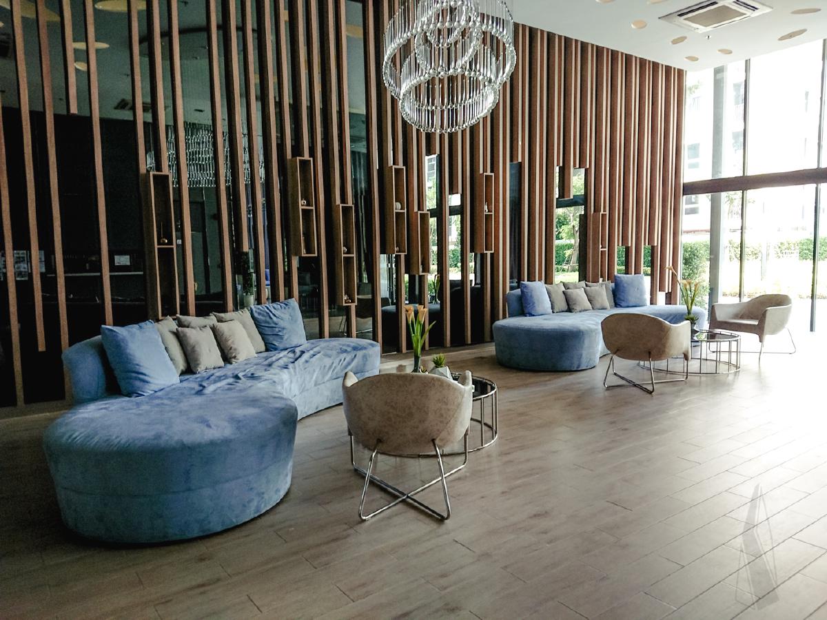 บรรยากาศภาายในล็อบบี้ ออกแบบและตกแต่งผนังด้วยไม้ กระจกบานใหญ่ และชุดโซฟาสีฟ้าสดใส นอกจากนี้ยังเพิ่มความหรูหราด้วยโคมระย้า ดูแล้วโอ่โถงสวยงามดี