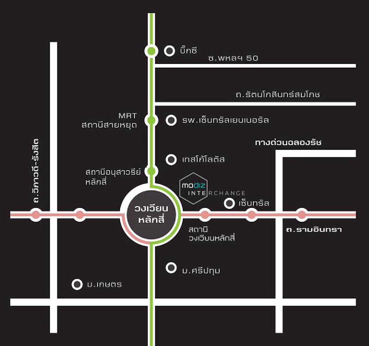 ทั้งนี้โครงการ Modiz Interchange ( โมดิซ อินเตอร์เชนจ์ ) ถือว่าเป็นคอนโดที่น่าลงทุนอย่างมาก เพราะด้วยความที่ตัวคอนโดตั้งอยู่ในจุดอินเตอร์เชนจ์รถไฟฟ้า 2 สาย คือสายสีชมพู และสายสีเขียวเข้ม อีกทั้งยังอยู่ใกล้กับรถไฟฟ้าสายสีแดง สถานี หลักสี่ ทำให้ทำเลคอนโดโครงการนี้สามารถใช้บริการรถไฟฟ้าได้สะดวกทั้ง 3 สี อีกทั้งทำเลโดยรอบยังมีความอุดมสมบูรณ์ของแหล่งอาหารการกินที่มีทั้งตลาดสด และห้างสรรพสินค้า ที่รองรับกลุ่มผู้อยู่อาศัยเดิมในทำเลนี้ และแหล่งงานสถานที่ราชการสำคัญๆโดยรอบ