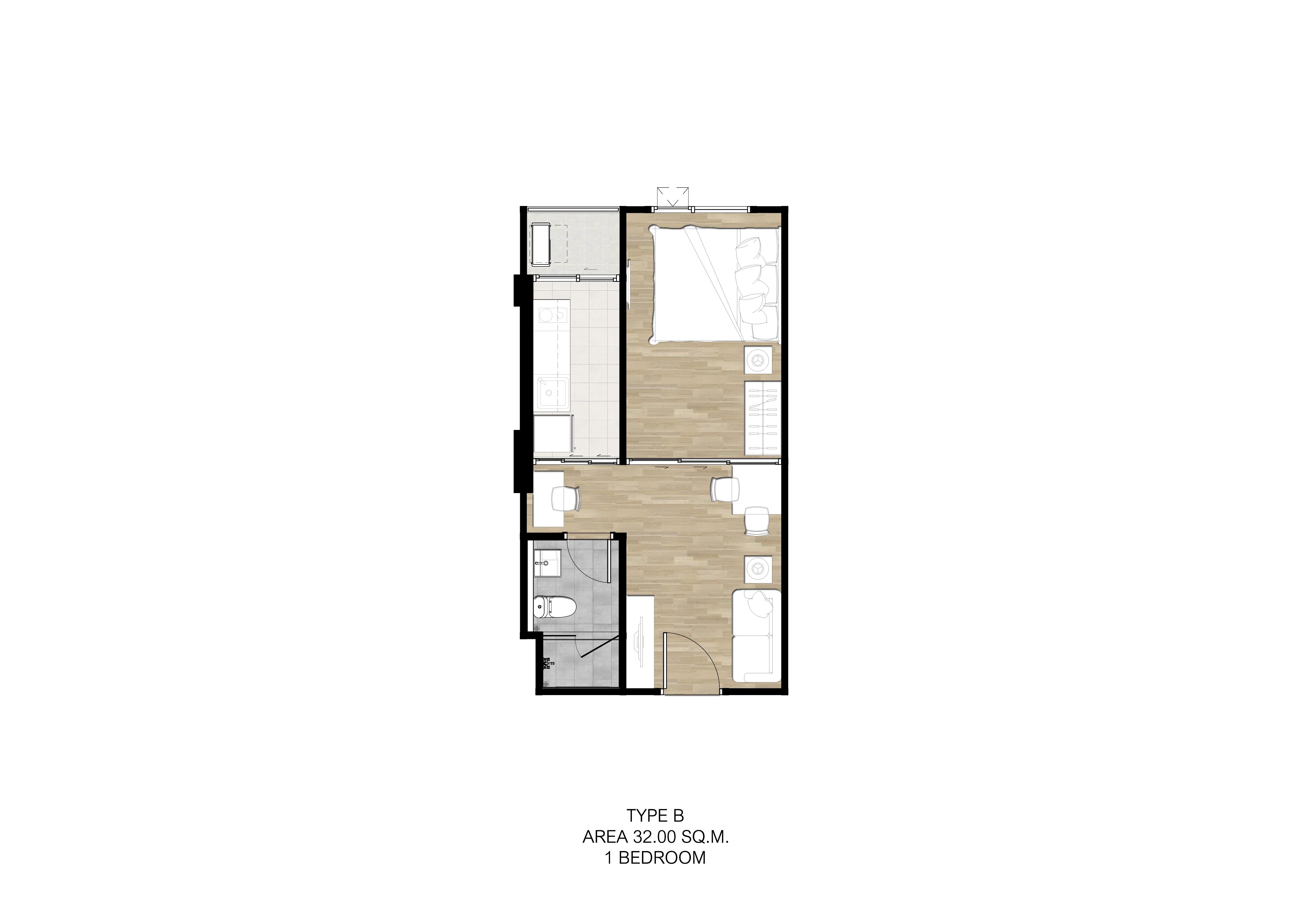 ขยับขนาดขึ้นมาอีกนิด เพื่อให้เรามีพื้นที่ใช้สอยมากยิ่งขึ้น กับห้องแบบ 1 ห้องนอน TYPE B ขนาด 32.00 ตร.ม. ที่แบ่งสัดส่วนการอยู่อาศัยและงานระบบออกจากกันชัดเจน