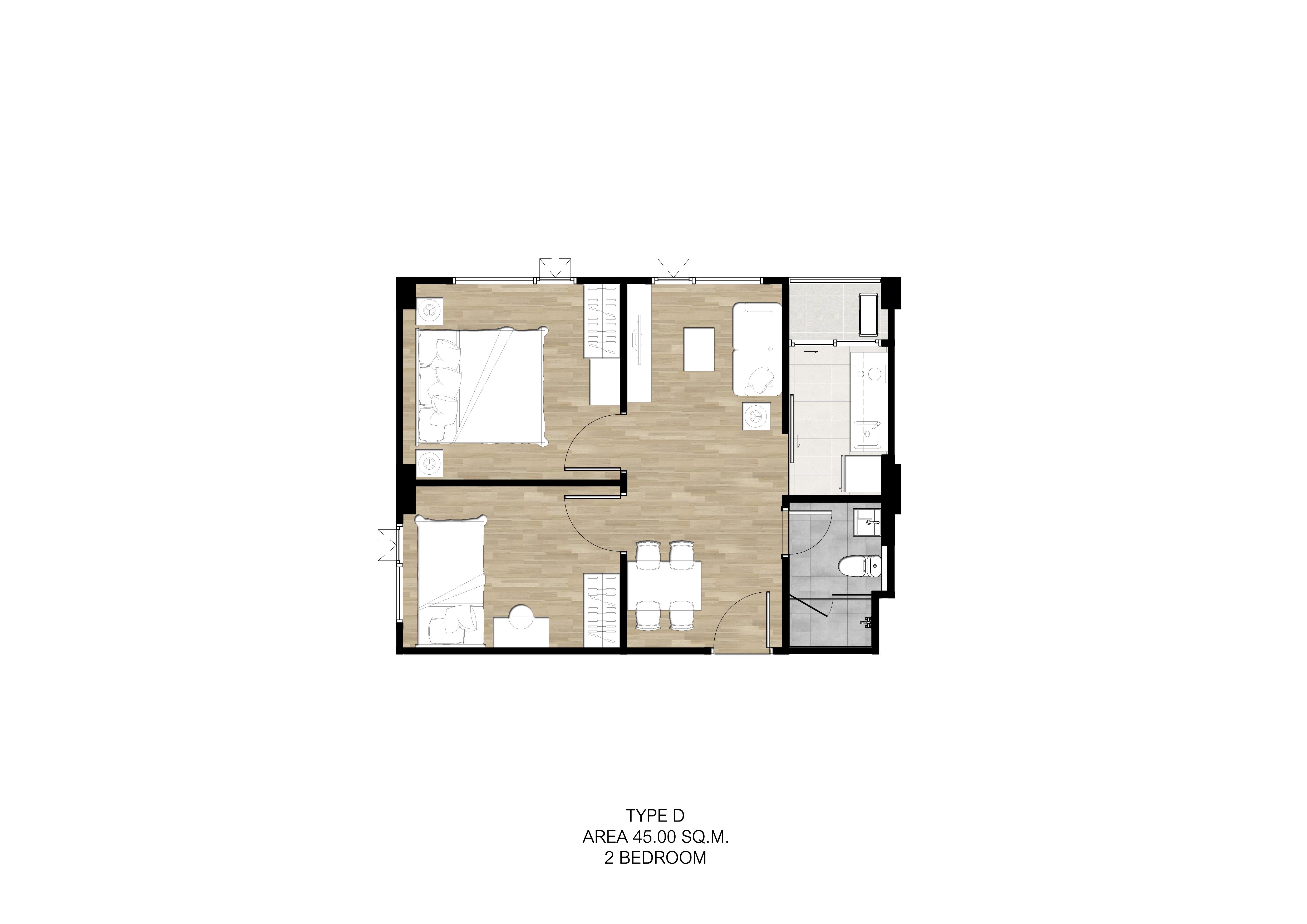 ห้องแบบ 2 ห้องนอน TYPE D ขนาด 45.50 ตร.ม. จะเหมาะกับผู้อยู่อาศัย 2 คน หรือครอบครัวไหนที่ต้องการห้องพักอาศัยที่ให้ความเป็นส่วนตัว ก็นับว่าตอบโจทย์เช่นกัน