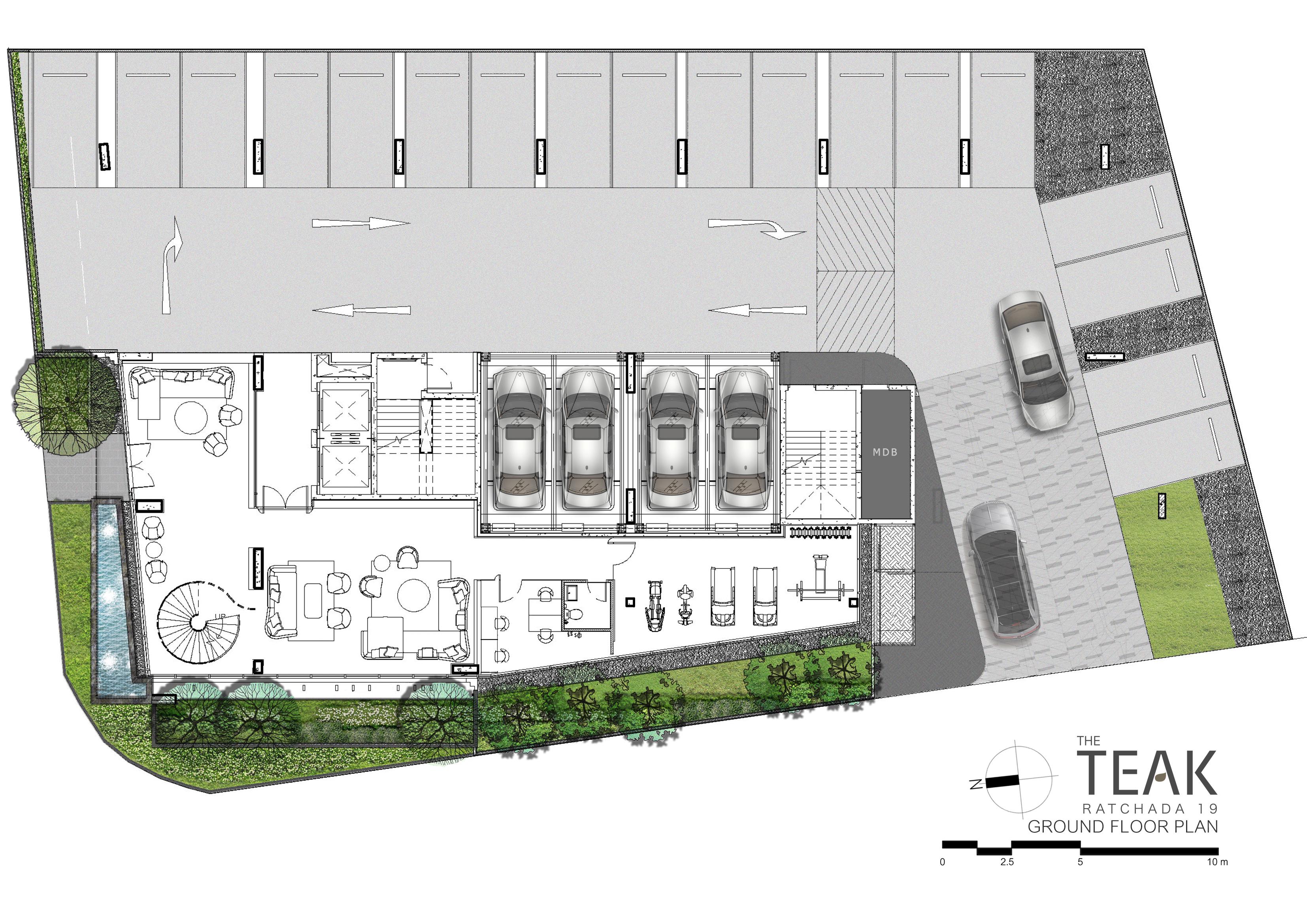 บนเนื้อที่โครงการกว่า 270 ตารางวา The Teak Ratchada 19 ได้จัดสรรพื้นที่ให้รองรับการใช้ชีวิตได้ครบทุกมิติ ให้ความส่วนตัวควบคู่ไปกับความสะดวกสบาย สำหรับชั้น Ground จะเป็นที่จอดรถแบบใต้อาคาร สามารถเข้าจอดได้สะดวก พร้อมด้วยที่จอดรถแบบ EV Changer และมีพื้นที่ส่วนกลางอยู่ทางด้านใน ทำให้ทุกคนในบ้านสามารถลงมาใช้บริการได้สะดวก โดยไม่รบกวนพื้นที่พักอาศัย