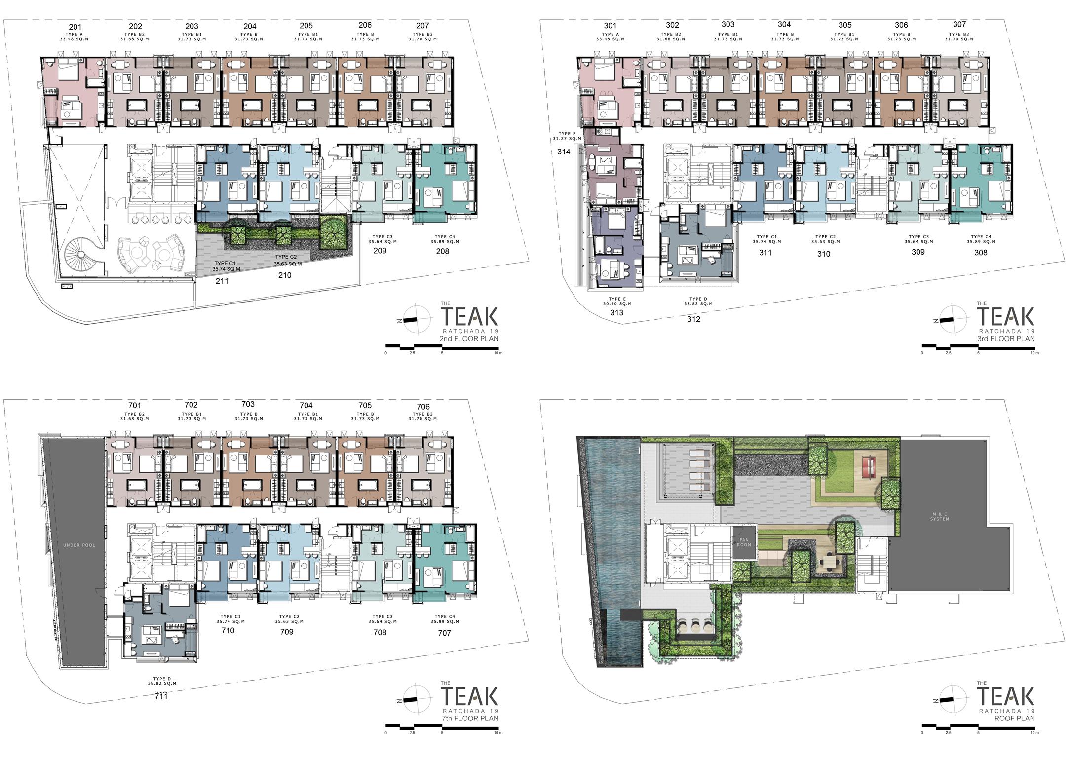 มาดูกันต่อในส่วนของห้องพักอาศัยโครงการ The Teak Ratchada 19 ที่จะมีทั้งหมด 12 Type แบ่งเป็นห้องแบบ 1 ห้องนอน ขนาด 30.40 - 35.89 ตารางเมตร และห้องแบบ 1 ห้องนอน Plus ขนาด 38.82 ตารางเมตร ดังนี้