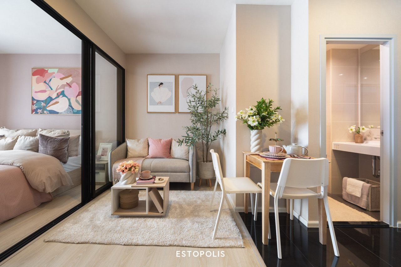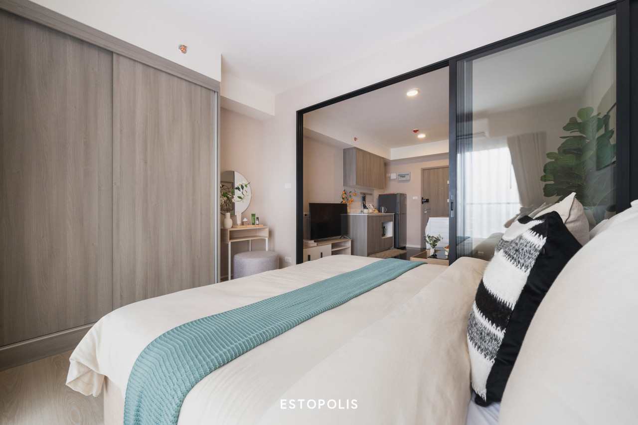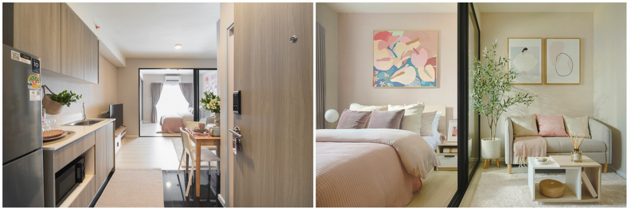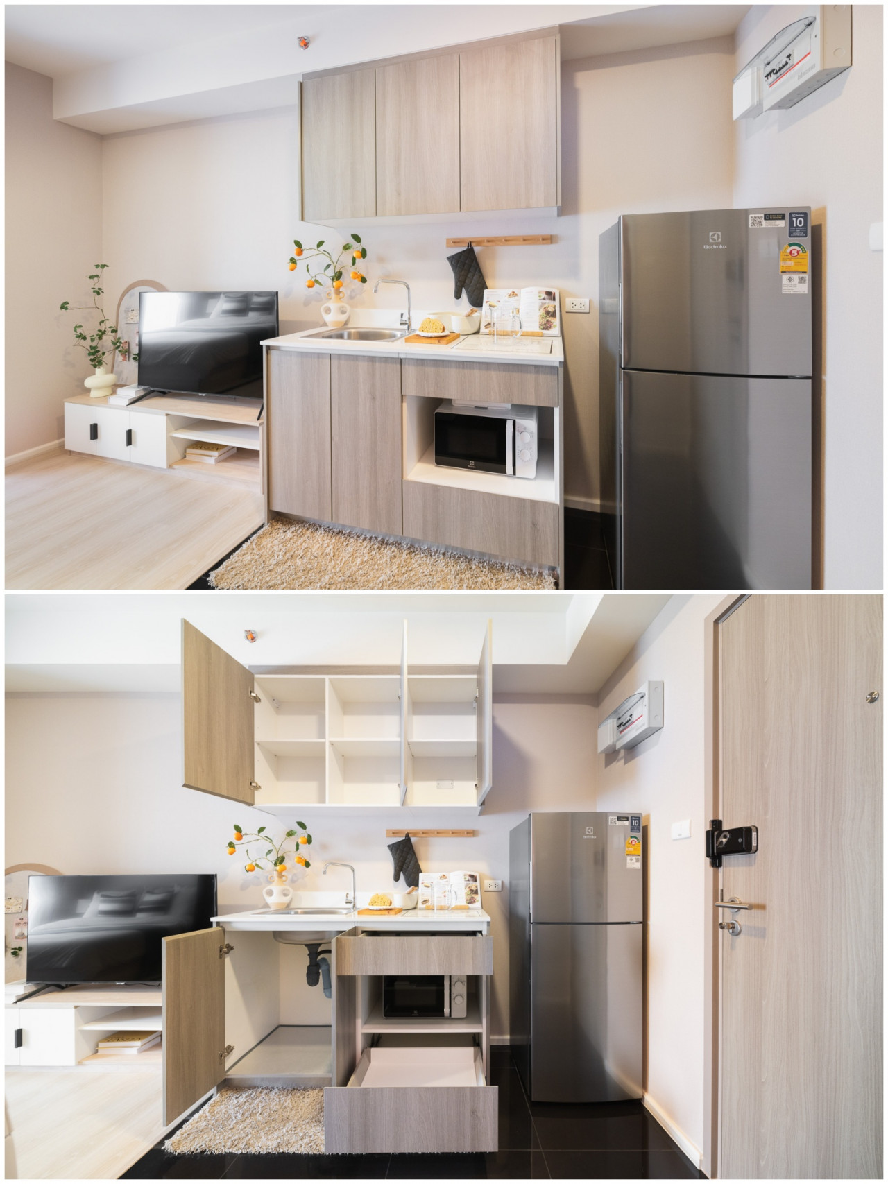 - การออกแบบห้องพักเน้นความโปร่งโล่ง ขนาดห้องเริ่มต้นใหญ่ที่สุดในย่าน จึงตอบโจทย์การใช้งานเมื่ออยู่อาศัยจริง พร้อมฟังก์ชันหลากหลายรูปแบบ