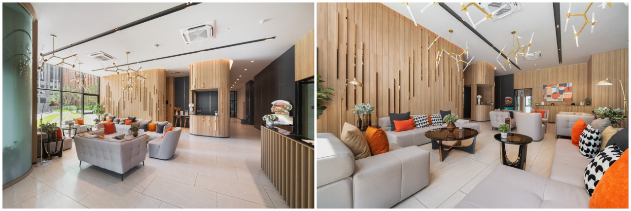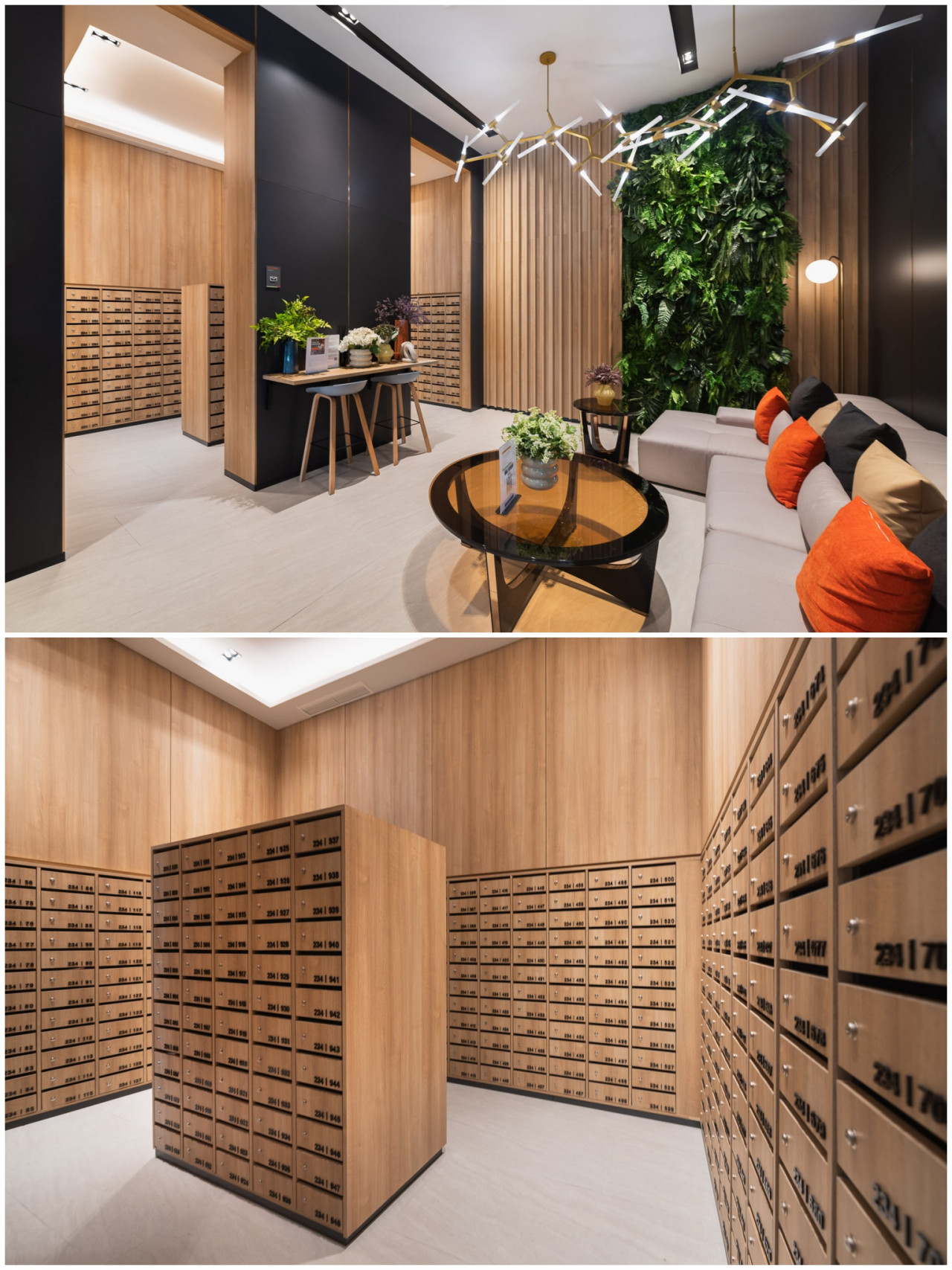 ในด้านพื้นที่ส่วนกลางบริเวณชั้น 1 จะประกอบด้วย พื้นที่บริเวณร้านค้าที่มีอยู่จำนวน 2 ร้าน และมีการแยกพื้นที่ล็อบบี้ออกเป็น 2 ฝั่ง โดยเราจะเริ่มต้นกันที่ล็อบบี้ A ที่ออกแบบมาให้ดูโปร่งจากการที่เปิดรับแสงธรรมชาติด้วยกระจกบานใหญ่ที่สูงจากพื้นจรดเพดาน บวกกับสไตล์การตกแต่งที่เน้นสีโทนอบอุ่นดูเป็นธรรมชาติ ยิ่งช่วยสร้างสุนทรียภาพในการนั่งเล่น พักผ่อนได้มากยิ่งขึ้น เมื่อเดินเข้าไปก็จะเจอ Mail Box ห้องน้ำ ไปจนถึงโถงลิฟต์ที่มีให้ 4 ตัวได้เลย