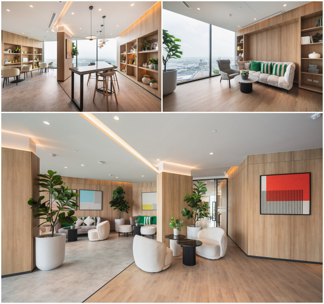 พาขึ้นมาชมวิวในมุมสูงจากชั้น 34 ที่รวม Facilities หลักๆของโครงการไว้ที่นี่ ซึ่งบริเวณ Co-Living Space ที่มีทั้ง Meeting Room และ Co-Kitchen Space ให้ใช้งาน โดยสามารถ Take View มุมสูงผ่านกระจกที่ออกแบบมาให้เปิดโล่ง ซึ่งเหมาะจะทำเป็นพื้นที่พบปะสังสรรค์กัน