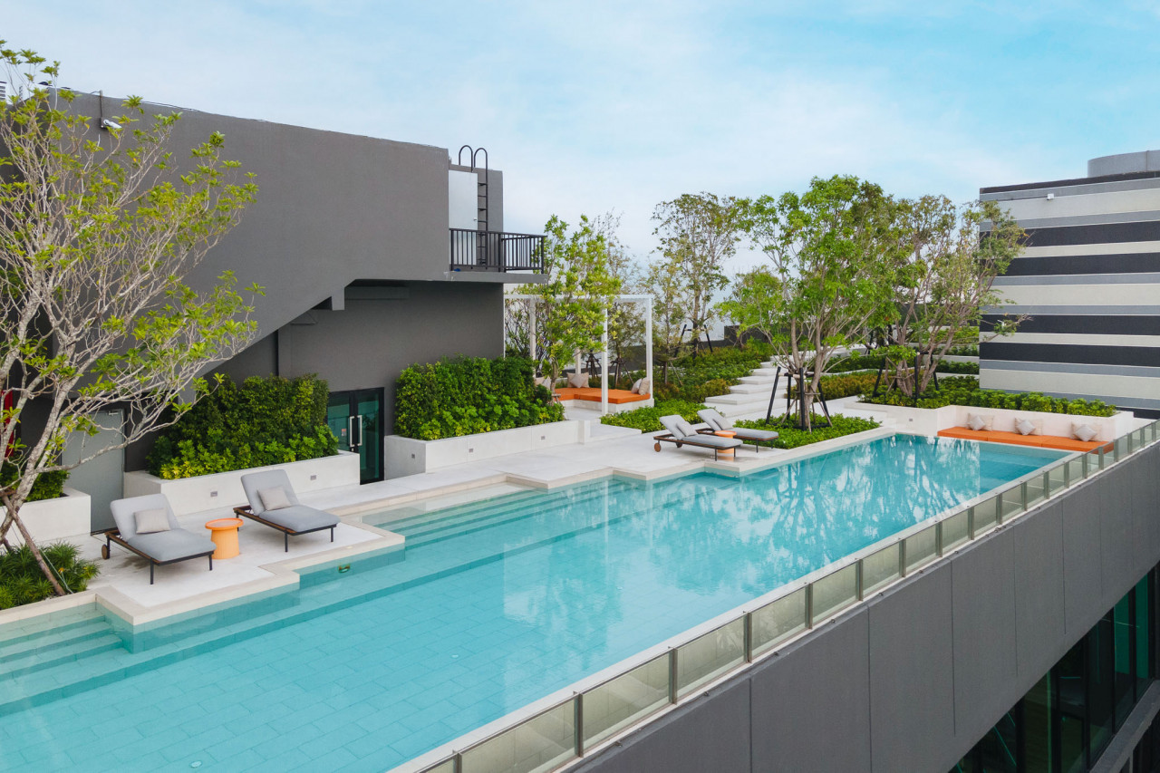 ขยับขึ้นมาชั้น Rooftop ซึ่งส่วนกลางที่ชั้นนี้จะประกอบด้วย Panorama Sky Infinity Edge Pool, Kid Pool และ Sky Park ที่ดีไซน์มาให้เหมาะสำหรับการออกกำลังกาย พักผ่อน ไปจนถึง Take View ได้ 180 องศา ได้ทั้งบริเวณสวนและบริเวณสระว่ายน้ำ