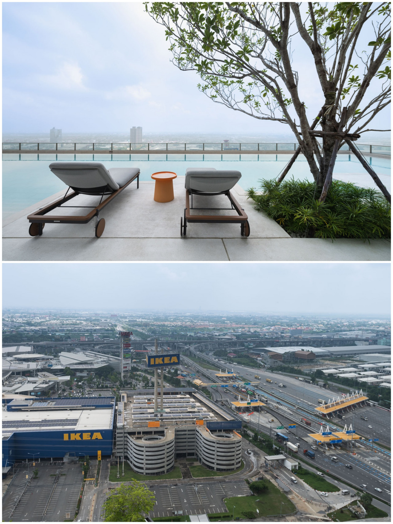 โดย Infinity Edge Pool ออกแบบมาให้ไร้ขอบสระ แต่จะมีราวกันตกเสริมมาให้ จึงเหมาะสำหรับการชมวิวโดยไม่มีอะไรบดบังสายตา พร้อมกับการว่ายน้ำออกกำลังกายไปพร้อมๆ กันได้ ซึ่งวิวที่เห็นก็จะเป็น City View ของโซนบางนามองเห็น IKEA ที่อยู่ฝั่งตรงข้ามได้อย่างชัดเจน และในช่วงเย็นๆ ค่ำๆ จะเต็มไปด้วยแสงไฟสวยงาม ดูแล้วโรแมนติกไปอีกแบบ