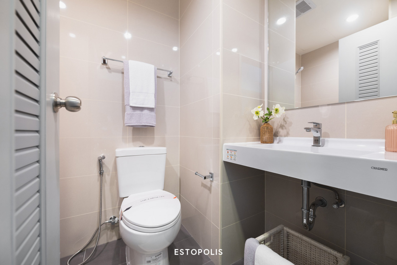 ตรงข้ามกับพื้นที่ครัวจะเป็นพื้นที่ห้องน้ำที่ทำการแยกพื้นที่โซนเปียกและโซนแห้งมาให้เพื่อให้ง่ายกับการทำความสะอาด โดยภายในห้องน้ำตกแต่งพื้นและผนังด้วยกระเบื้องเซรามิก และติดตั้งสุขภัณฑ์มาให้ครบชุด