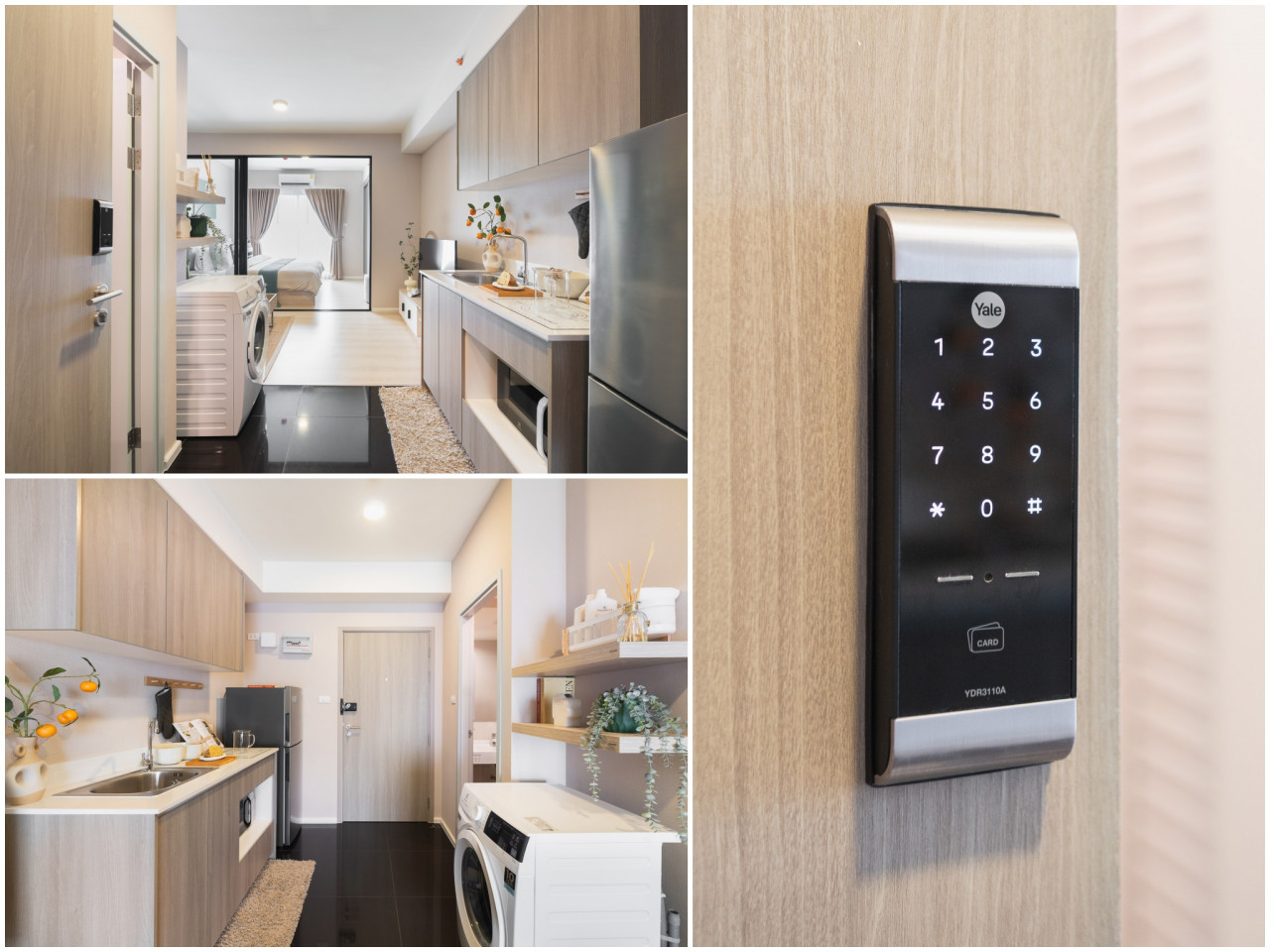 ขยายพื้นที่ความสุขด้วยฟังก์ชันตัวห้องที่ออกแบบมาให้สอดรับกับไลฟ์สไตล์ของการอยู่อาศัย ด้วยขนาดห้องที่กว้างขวางแบบ 1 Bedroom ขนาด 28 ตารางเมตร ซึ่งเมื่อเปิดประตูเข้ามาก็จะเจอกับการจัดวาง Layout ที่ลงตัวเริ่มต้นจากประตูที่มีการติดตั้ง Digital Doorlock ของ Yale มาให้เรียบร้อย พร้อมกับจัดเต็มด้านดีไซน์ของเฟอร์นิเจอร์ที่แต่งมาให้แล้วแบบ Fully Furnished จาก SB Design