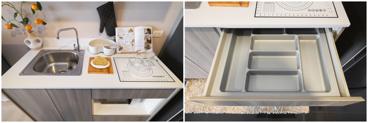 เคานต์เตอร์ครัวจะประกอบด้วยตู้เก็บของและลิ้นชักสำหรับใส่ช้อนส้อม และมีอ่างล้างจานแบบหลุมเดี่ยวมาให้ ส่วนด้านข้างมีพื้นที่สำหรับติดตั้งเตาทำอาหาร พร้อมติดตั้งจุดปลั๊กไฟมาให้